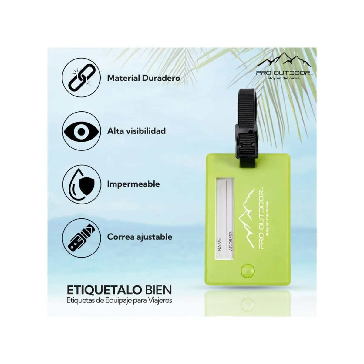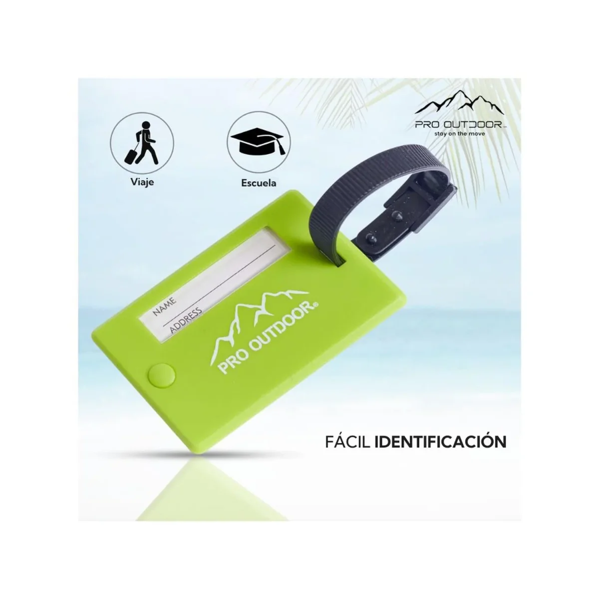 El Identificador Para Maleta Pro Outdoor es la opción ideal para personalizar y proteger tu equipaje durante tus viajes. Este identificador, disponible en un llamativo color verde, ayuda a hacer tu maleta única y fácilmente reconocible, reduciendo el riesgo de pérdida en aeropuertos o estaciones concurridas.El diseño del Identificador Para Maleta Pro Outdoor incluye una correa flexible y segura que mantiene el tag en su lugar durante todo el trayecto. Además, la correa es extraíble, lo que facilita su apertura cuando sea necesario. Con un estilo clásico y colores vibrantes, este identificador no solo asegura tu equipaje, sino que también le añade un toque distintivo y personal.Fabricado con materiales resistentes, el Identificador Para Maleta Pro Outdoor está diseñado para soportar el desgaste de los viajes frecuentes, asegurando su durabilidad en cualquier aventura. Como parte de la nueva línea de productos de viaje de Pro Outdoor, este identificador está pensado para ofrecer comodidad y estilo, haciendo tus paseos más prácticos y placenteros. Durable Seguro Comodo Se puede retirar la correa para abrir Correa flexible Verde