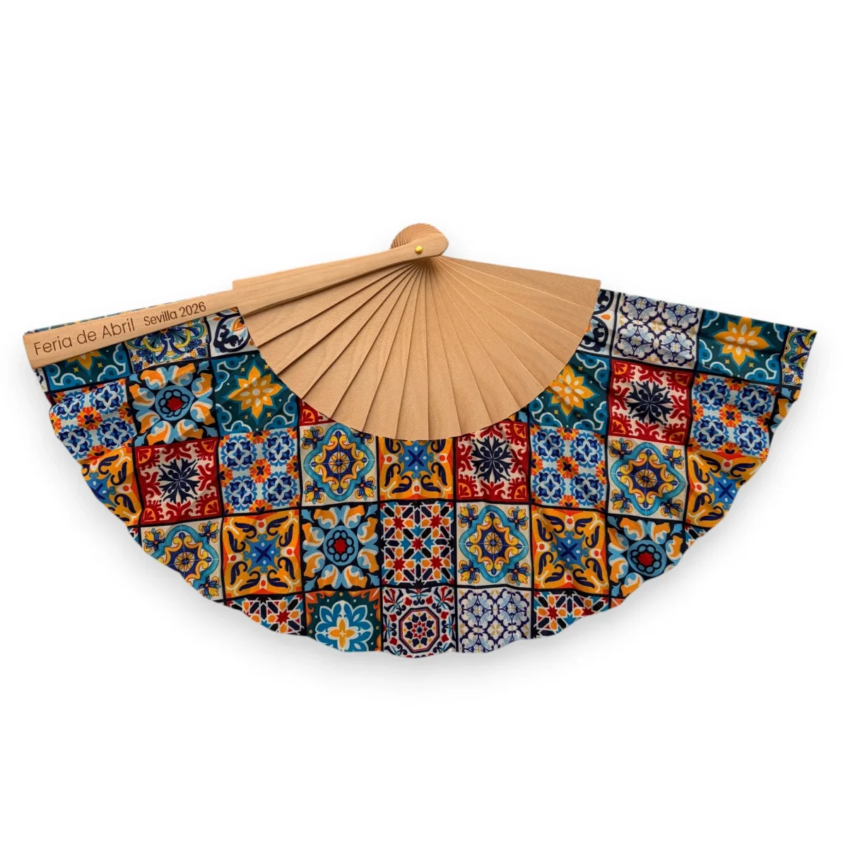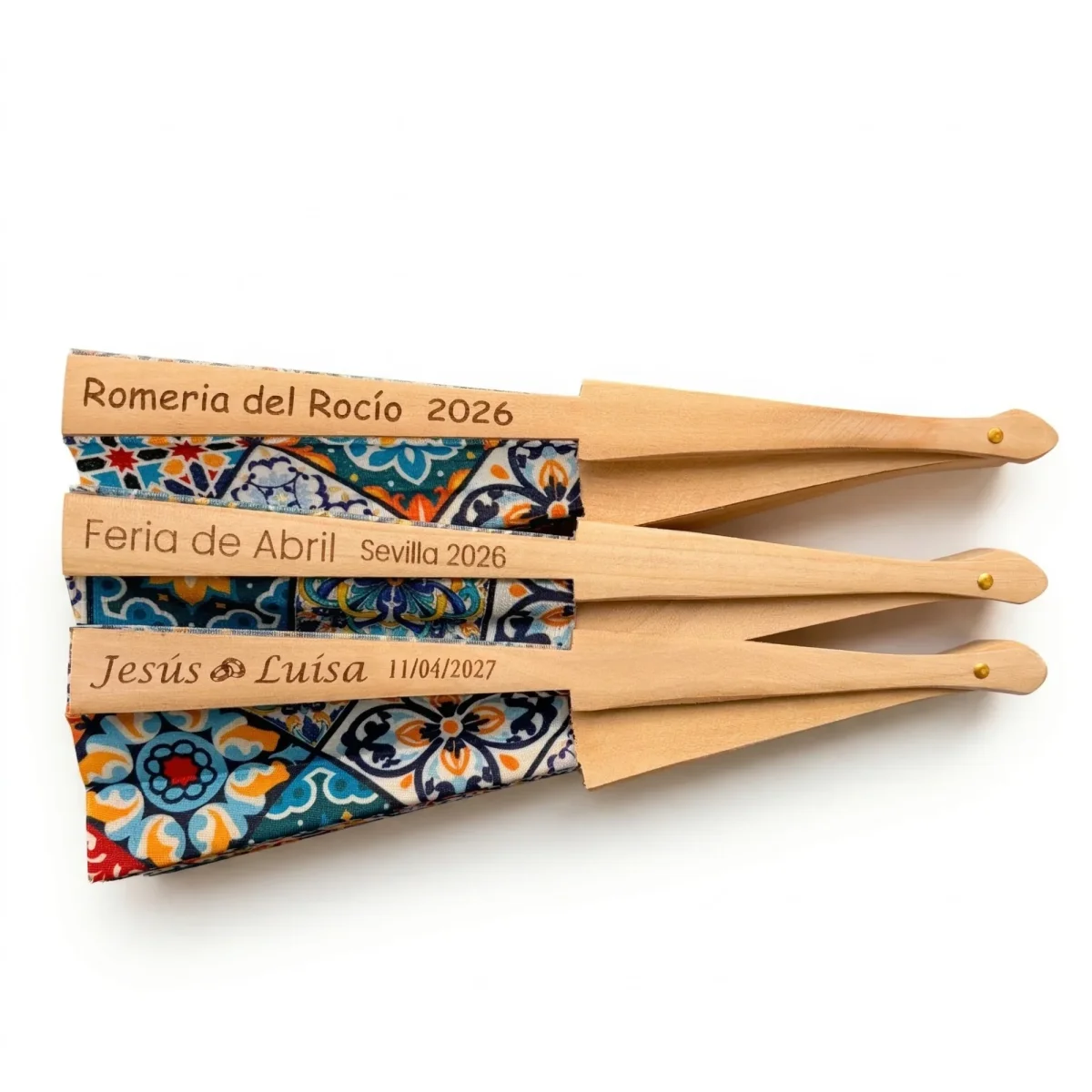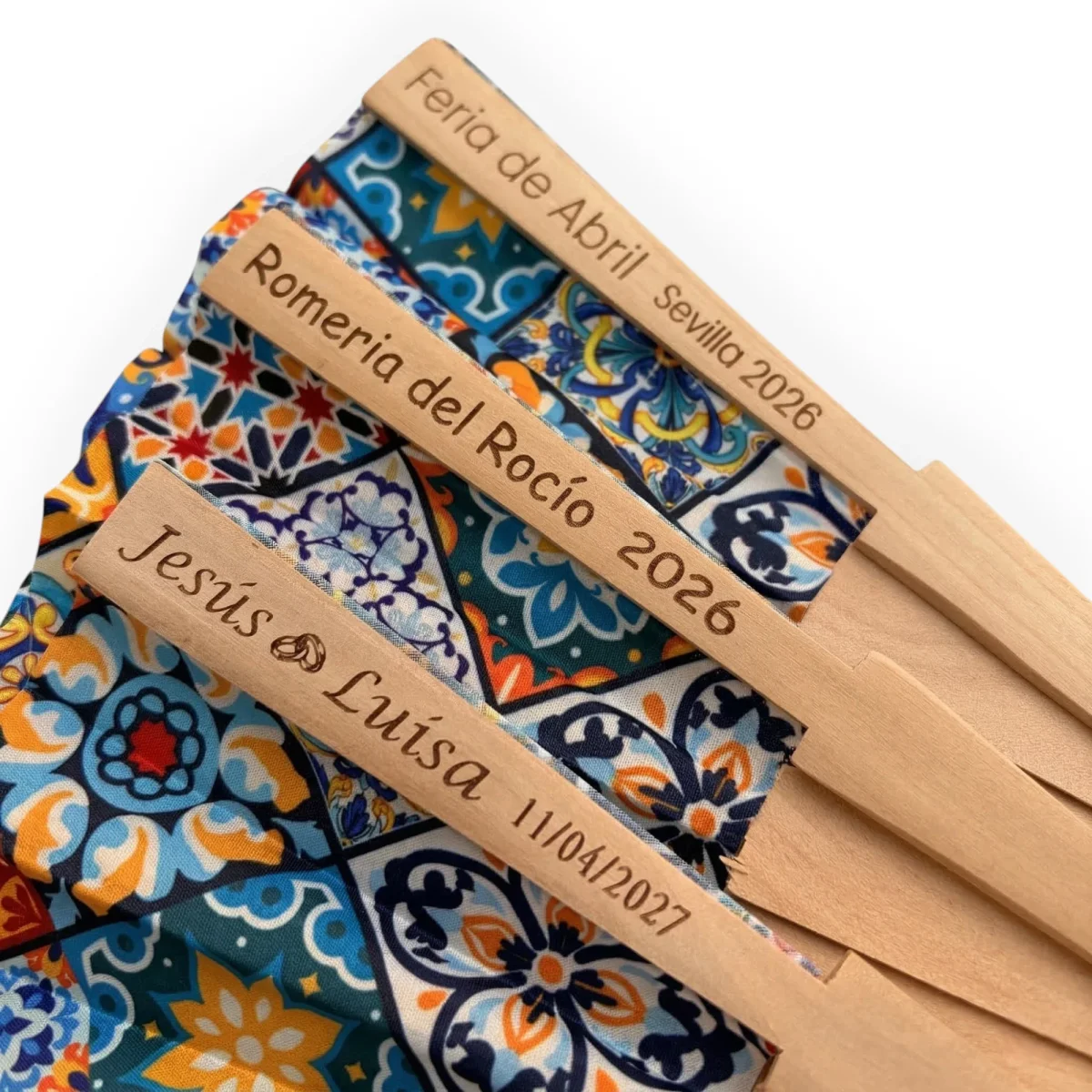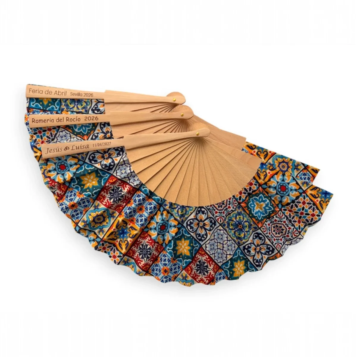 Abanicos personalizados tan bonitos que da pena cerrarlos. Tela estilo mosaico andaluz con colores vivos sobre varillas de madera natural con grabado láser a medida. El detalle de boda, feria o comunión que los invitados guardan para siempre.