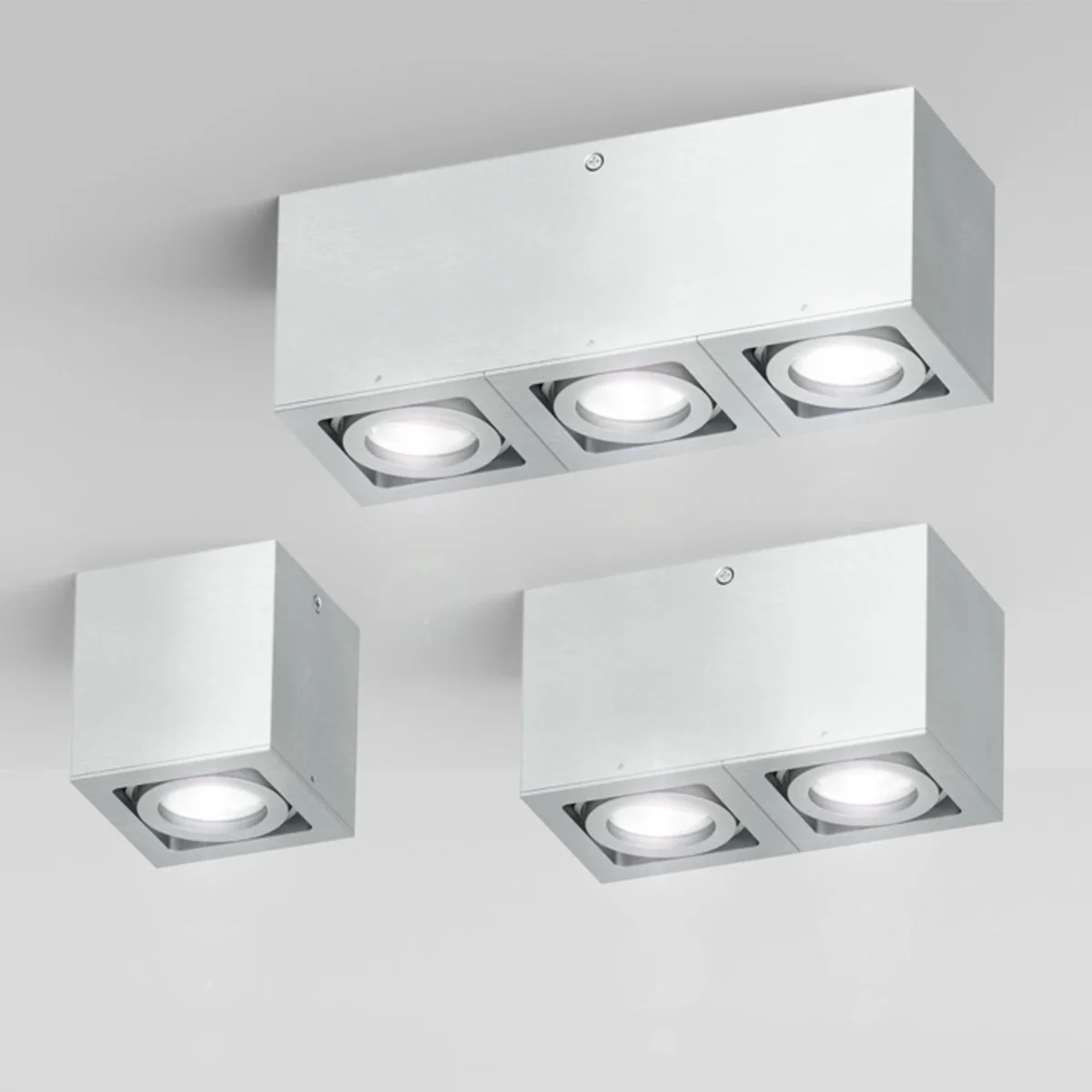 Luminaria rectangular, hecha de aluminio con bombillas dicroicas empotradas. Es inclinable en dos ejes.