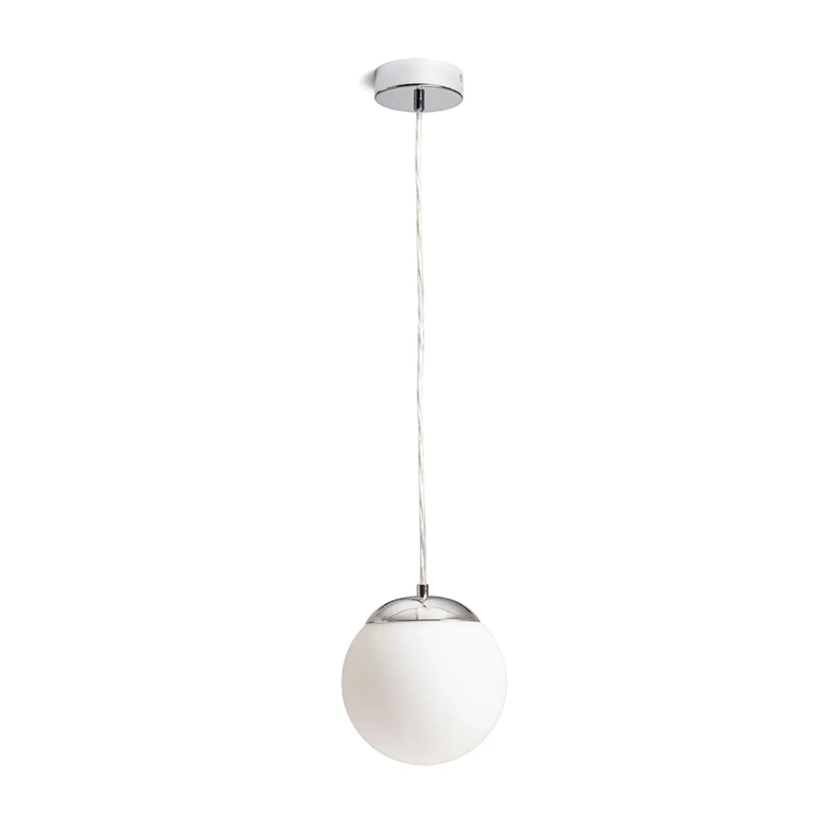 Luminaria colgante con cristal opalino y accesorios cromados. Adecuada para ambientes húmedos.