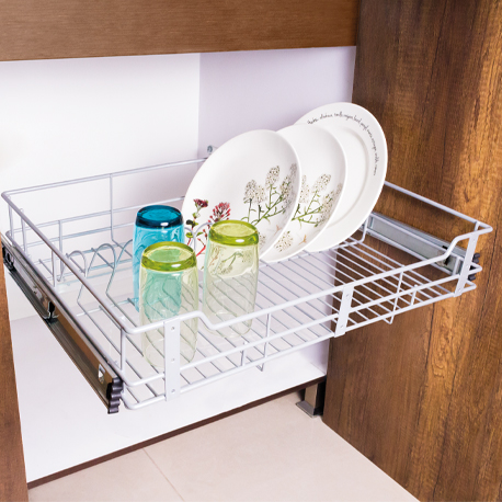 Optimiza el espacio en tu cocina. Organiza y cuida tu vajilla con el cierre suave y controlado de la Canasta platero classic 80 cm cierre lento de Rejiplas. Es ventilado y no retiene olores.