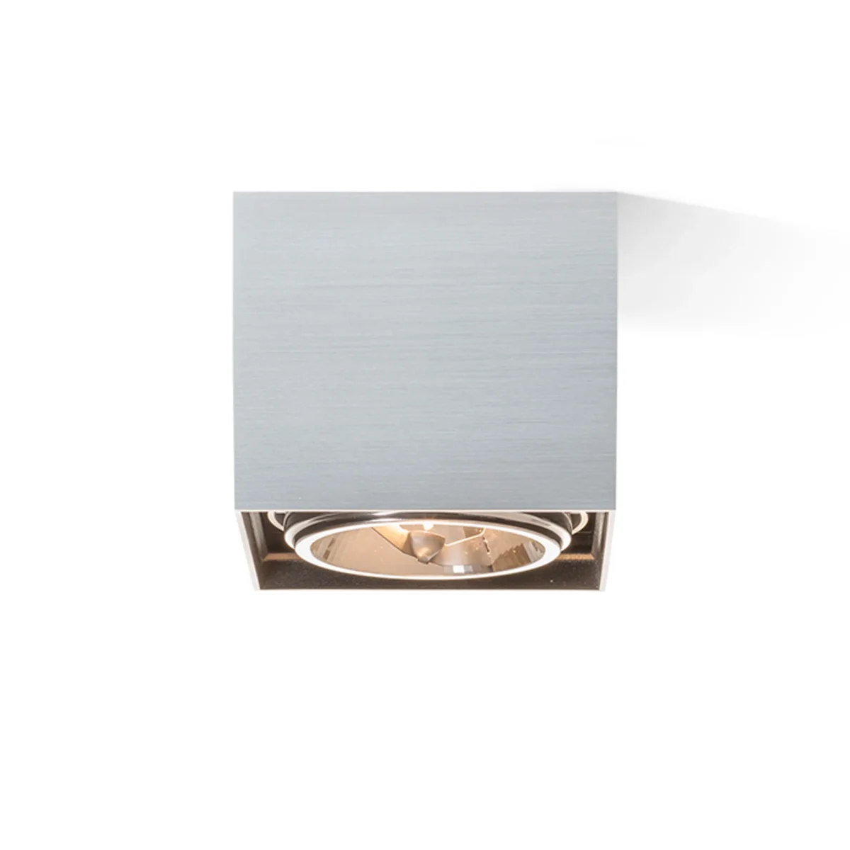 Luminaria de techo, hecha de aluminio para fuentes de luz halógena que son inclinables en dos ejes. La parte interior es negra.