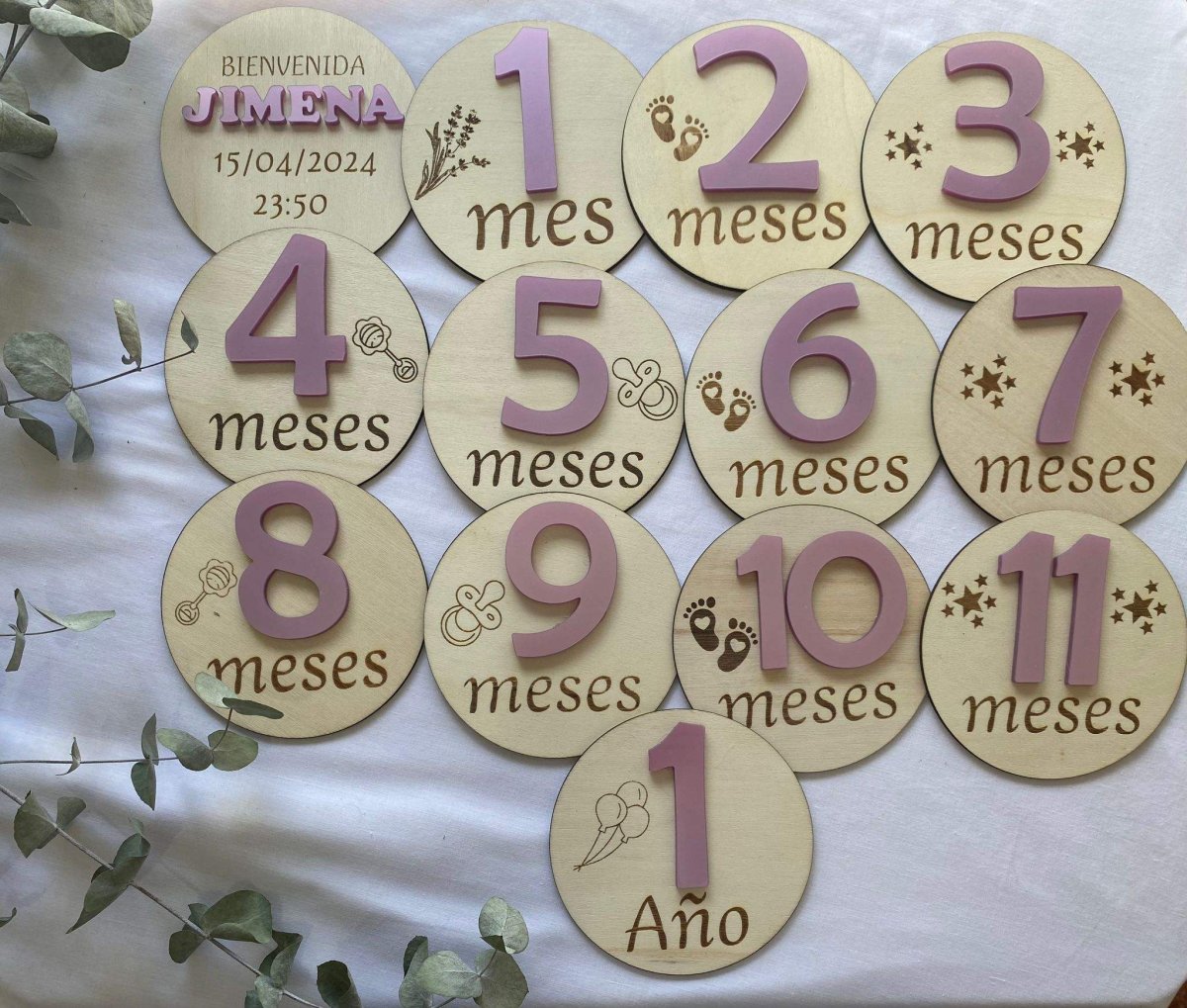 Regala Amor presenta discos cumple mes personalizados de 13 piezas (nombre, fecha de nacimiento + meses). Perfectos como recuerdo para bebé. Entrega rápida y calidad garantizada.