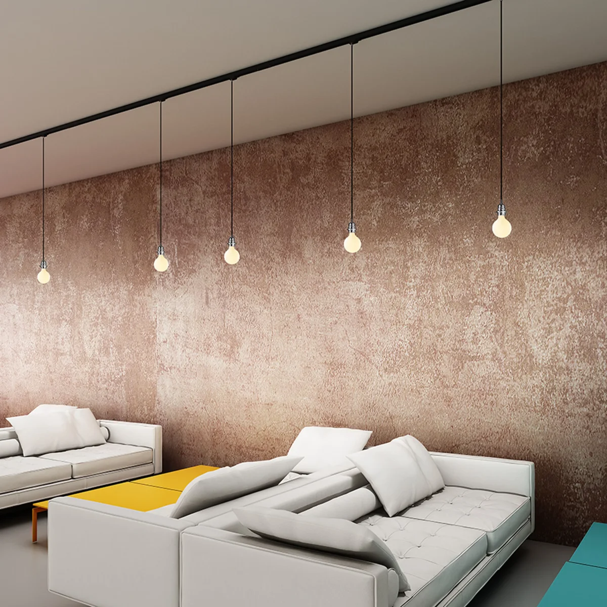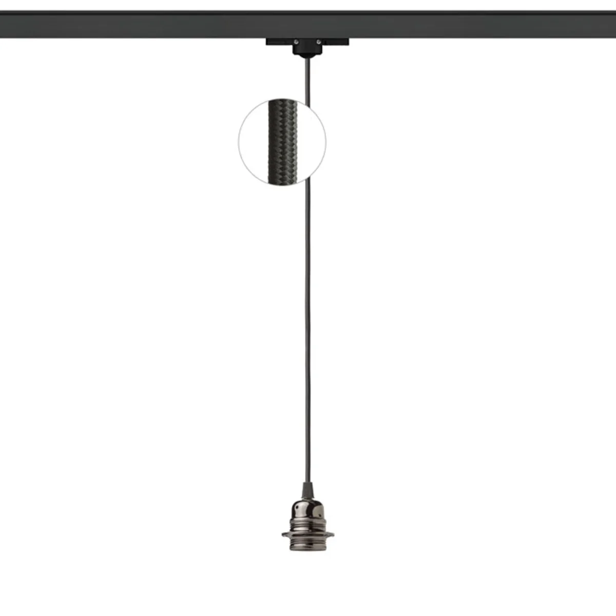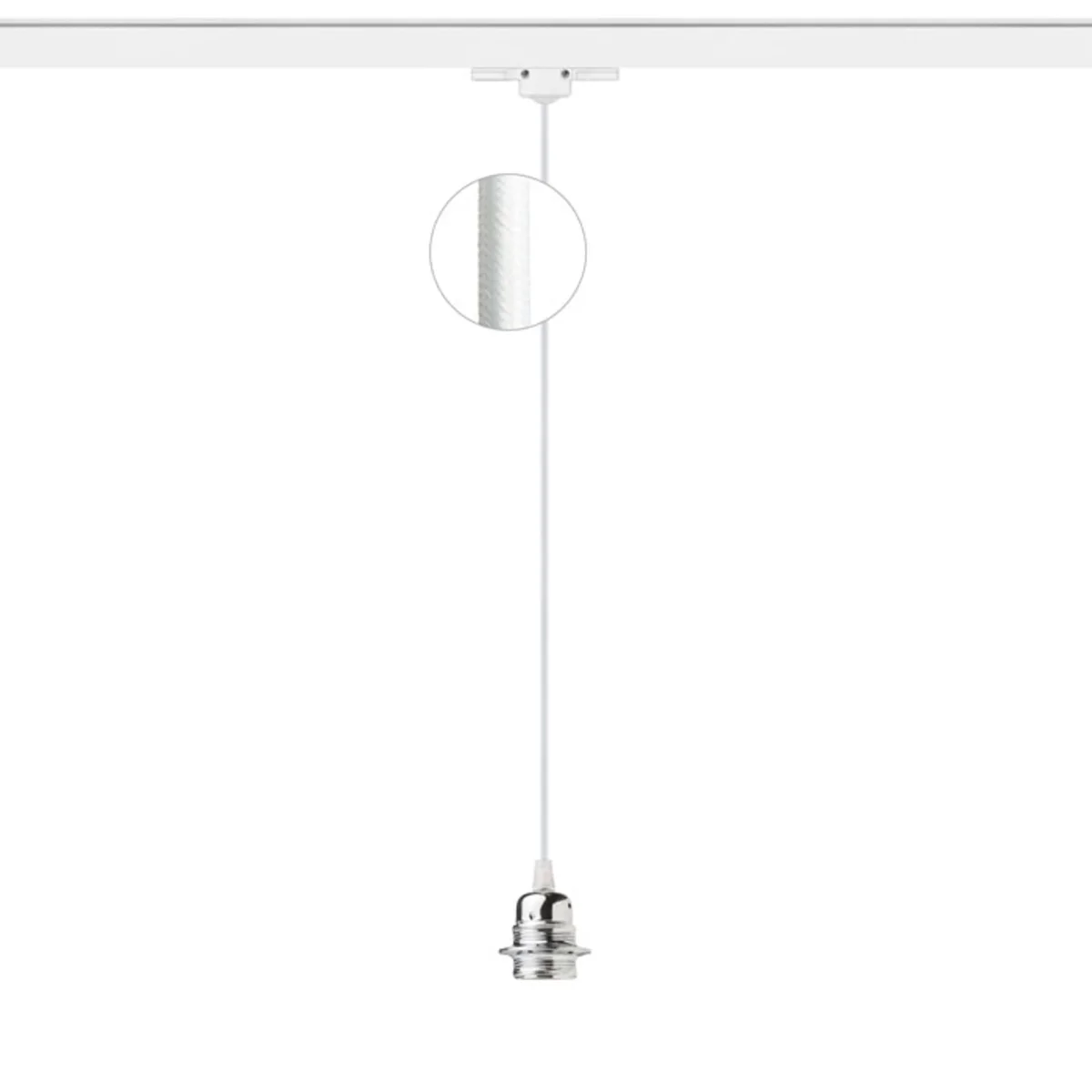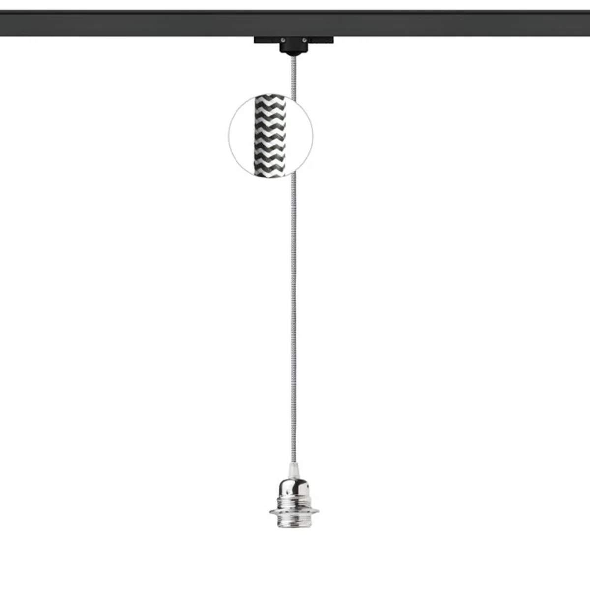 Cable textil en varias combinaciones de colores con base de metal E27, para uso con bombilla decorativa o pantalla adecuada. El cable termina con un adaptador para suspensión en carril trifásico.
