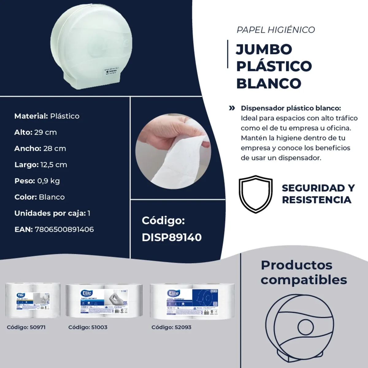 Compatible con papeles higiénicos Jumbo Elite códigos 52093, 52051, 51003 y 50971