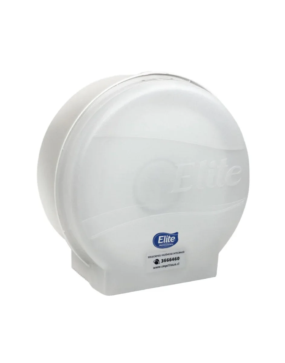 Dispensador de papel higiénico jumbo Elite, fabricado en plástico blanco resistente, ideal para baños de alto tráfico en empresas, oficinas y espacios comerciales.