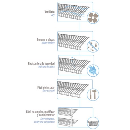 El Entrepaño en rejilla de Rejiplas es una solución práctica, funcional y duradera para optimizar el almacenamiento en tu clóset, vestier, zona de ropas o despensa. Gracias a su diseño abierto y ventilado, permite que el aire circule libremente, manteniendo tu ropa, zapatos, toallas o enseres frescos y libres de humedad.