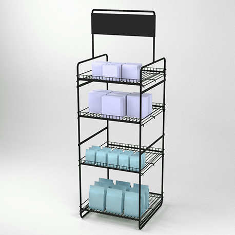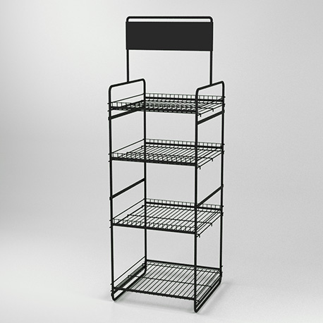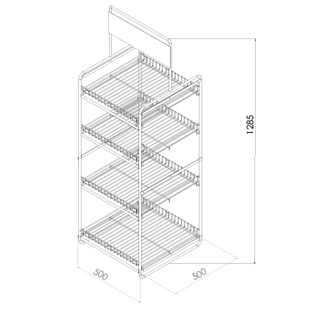 Exhibidor tipo mueble de 50 de ancho x 50 de profundidad con 4 niveles de canasta tipo entrepaño y un marco superior pensado para colgar publicidad a la medida. Es el exhibidor ideal para mostrar productos medianamente pesados, de forma cómoda y práctica (publicidad no incluida).