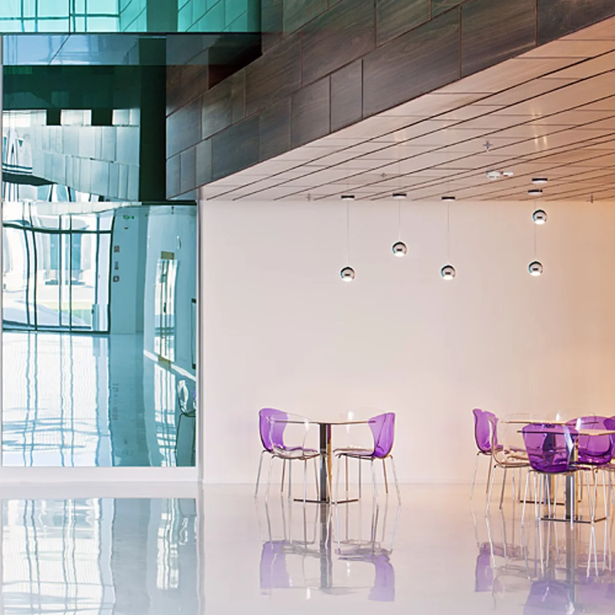 Lámpara colgante con una fuente de luz LED de alta potencia. La luz emitida por la lámpara se dispersa a través de un difusor acrílico esmerilado.