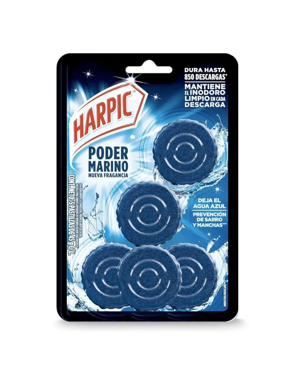 Las pastillas para estanque Harpic Power Plus limpian, desinfectan y previenen la formación de sarro de forma continua. Su fórmula avanzada mantiene el agua limpia y azul marino, asegurando un inodoro fresco y brillante en todo momento.