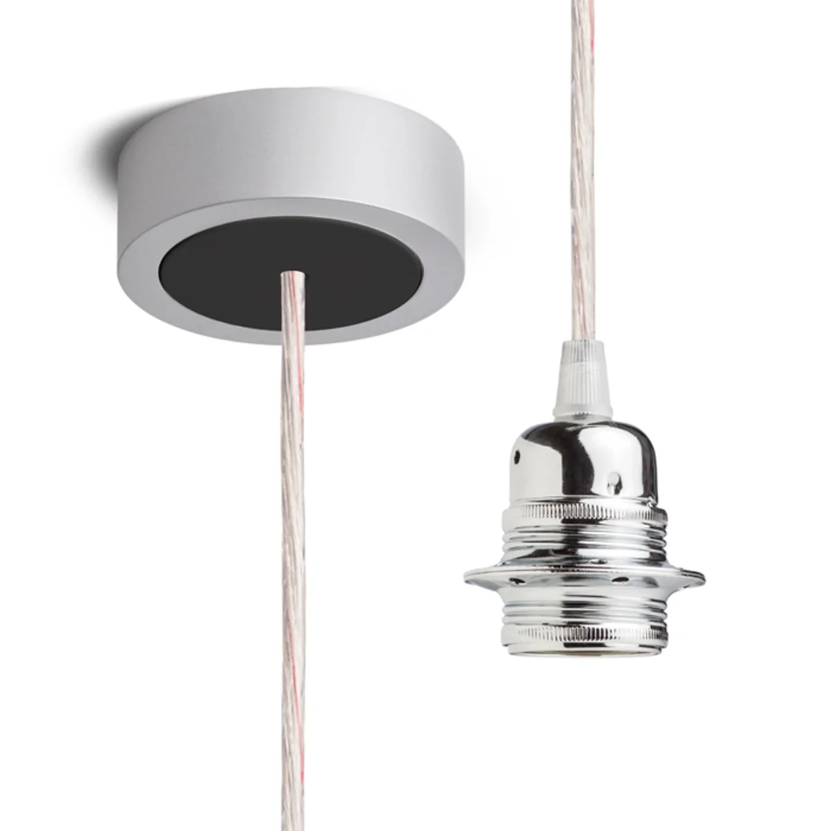 Kit de suspensión con base de aluminio pintado, base metálica E27 y cable textil. Para uso independiente o para colgar pantallas ligeras. Adecuado para pantallas: ARISTA, DELI, JAKARANDA, DOUBLE 40/30, DOUBLE 55/30, ASPRO 40/30, RON 40/25, RON 55/30, RON 60/19, TEMPO 30/19, TEMPO 50/19.