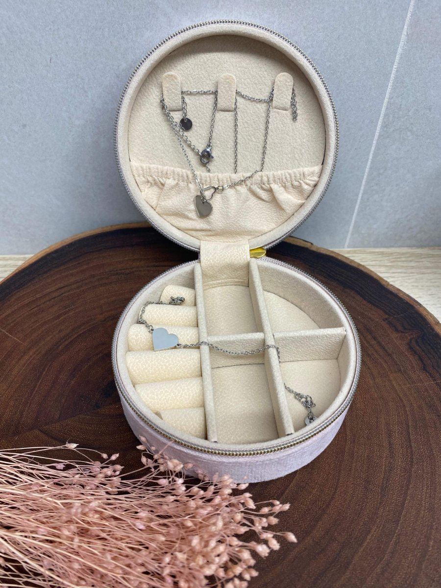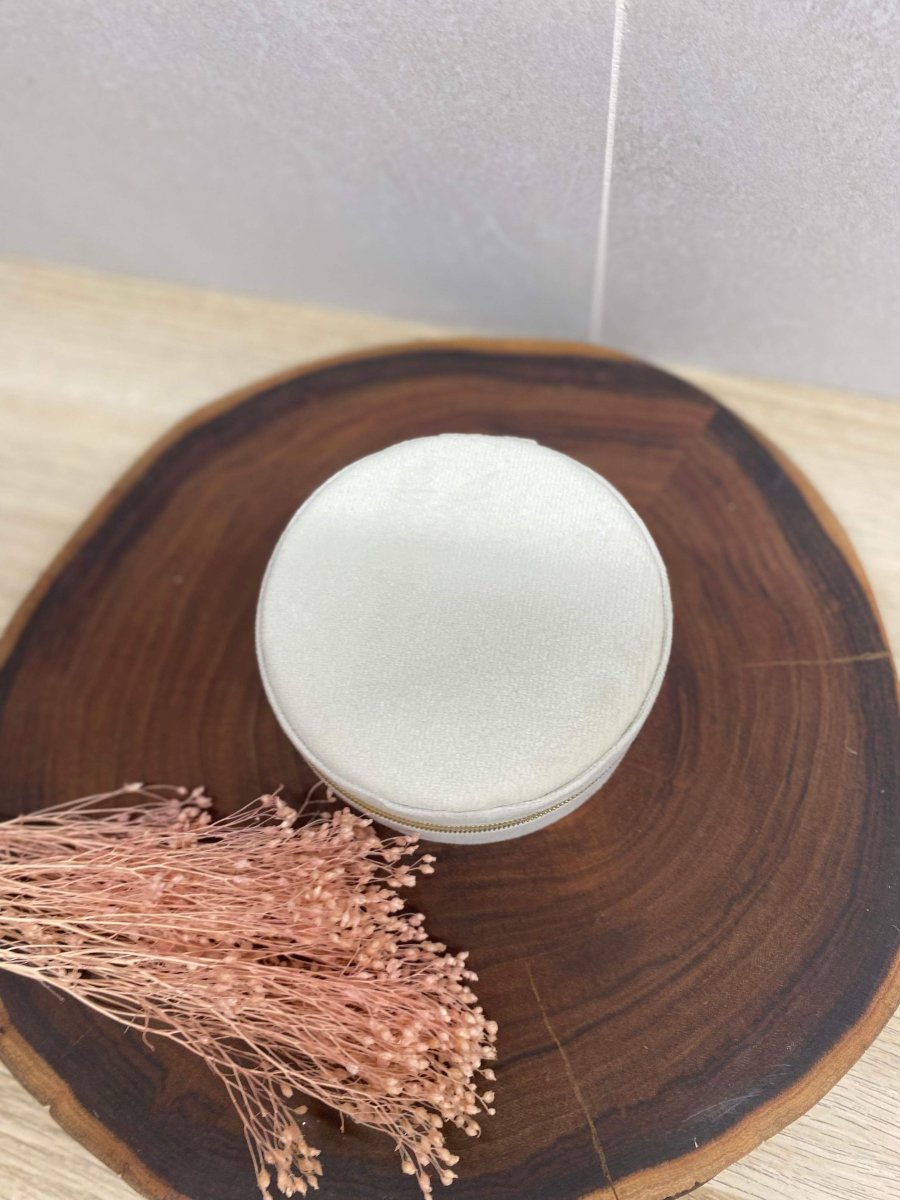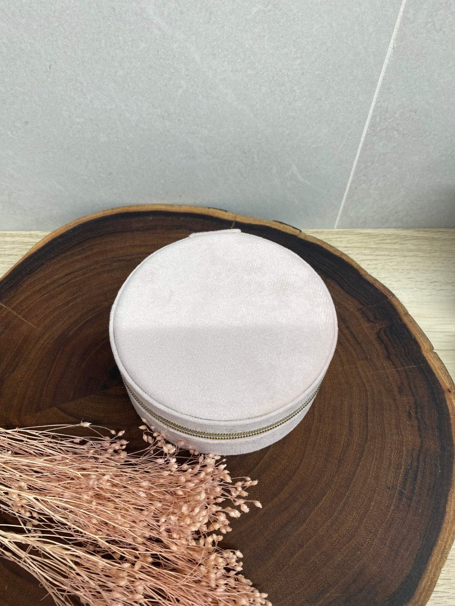 Joyero de terciopelo redondo personalizado con nombre y fecha. Regalo perfecto para novia, dama de honor o testigo el día de la boda.