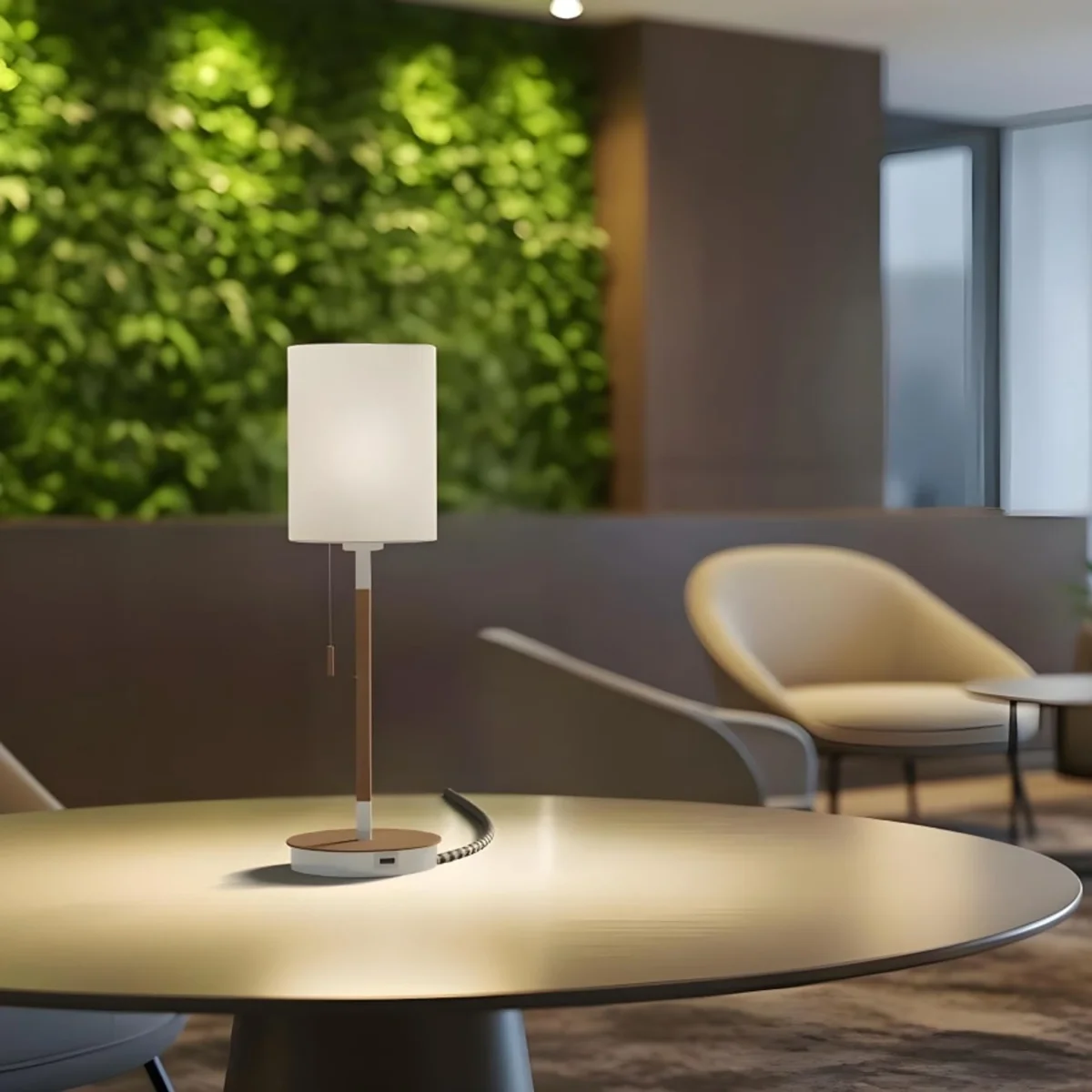 Base de mesa en imitación haya con puerto USB incorporado. Combinar con pantallas con montaje de rosca E27. Apto para pantallas: CONNY 15/30, DELI 30/20, DELISA 25/16, RON 15/20