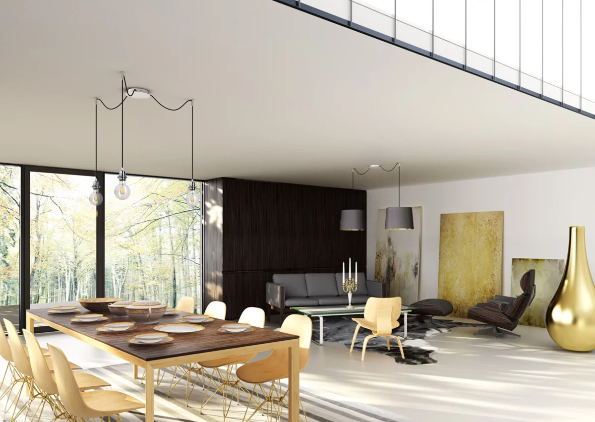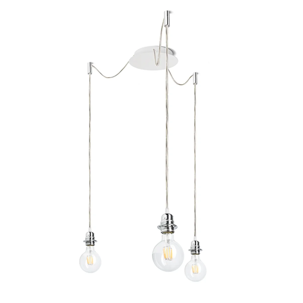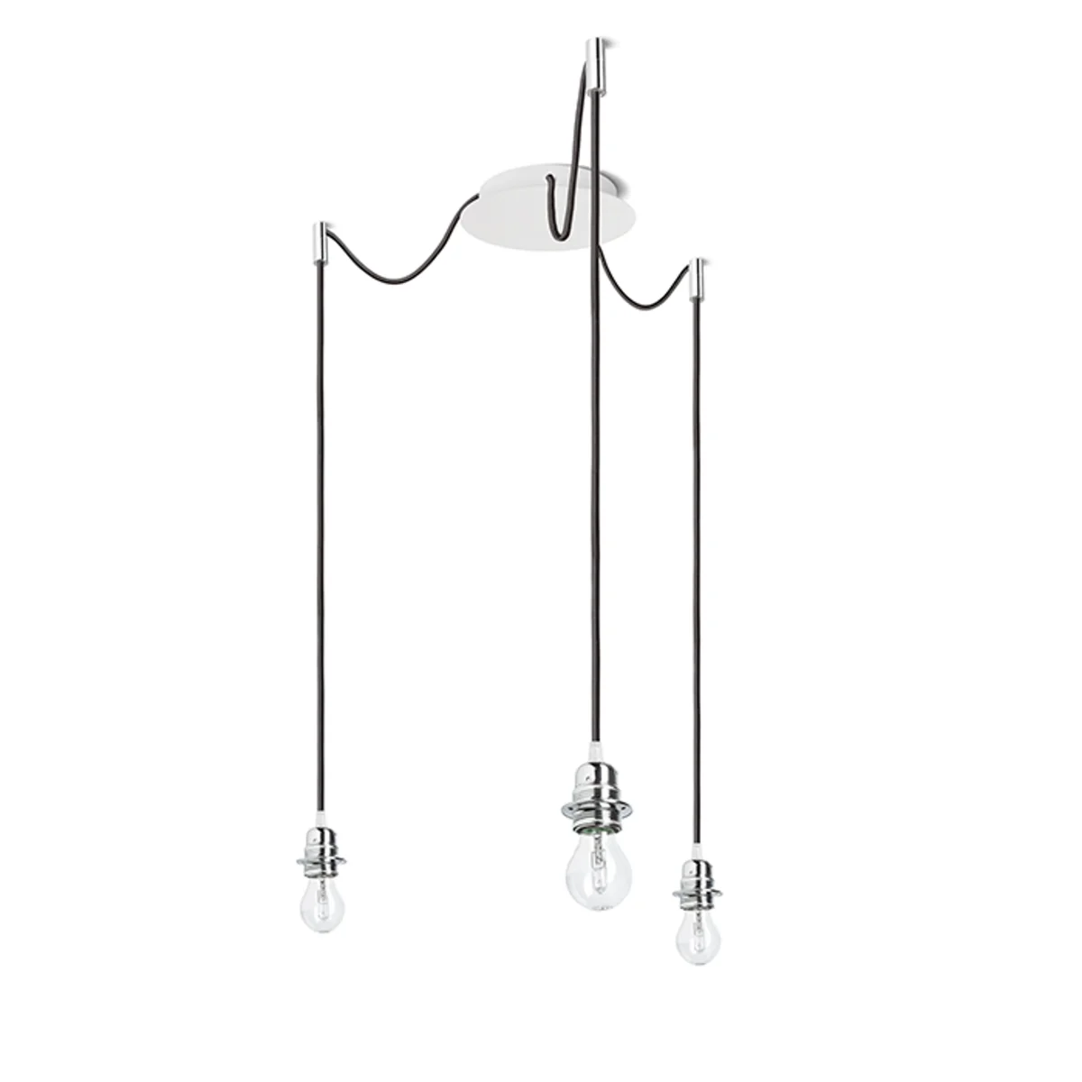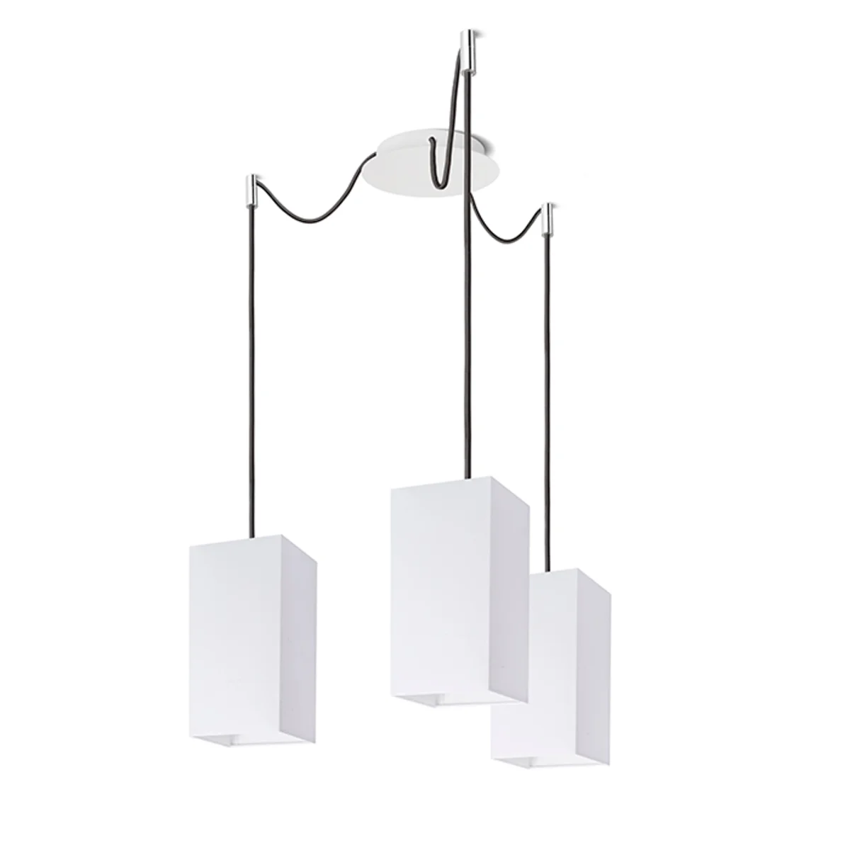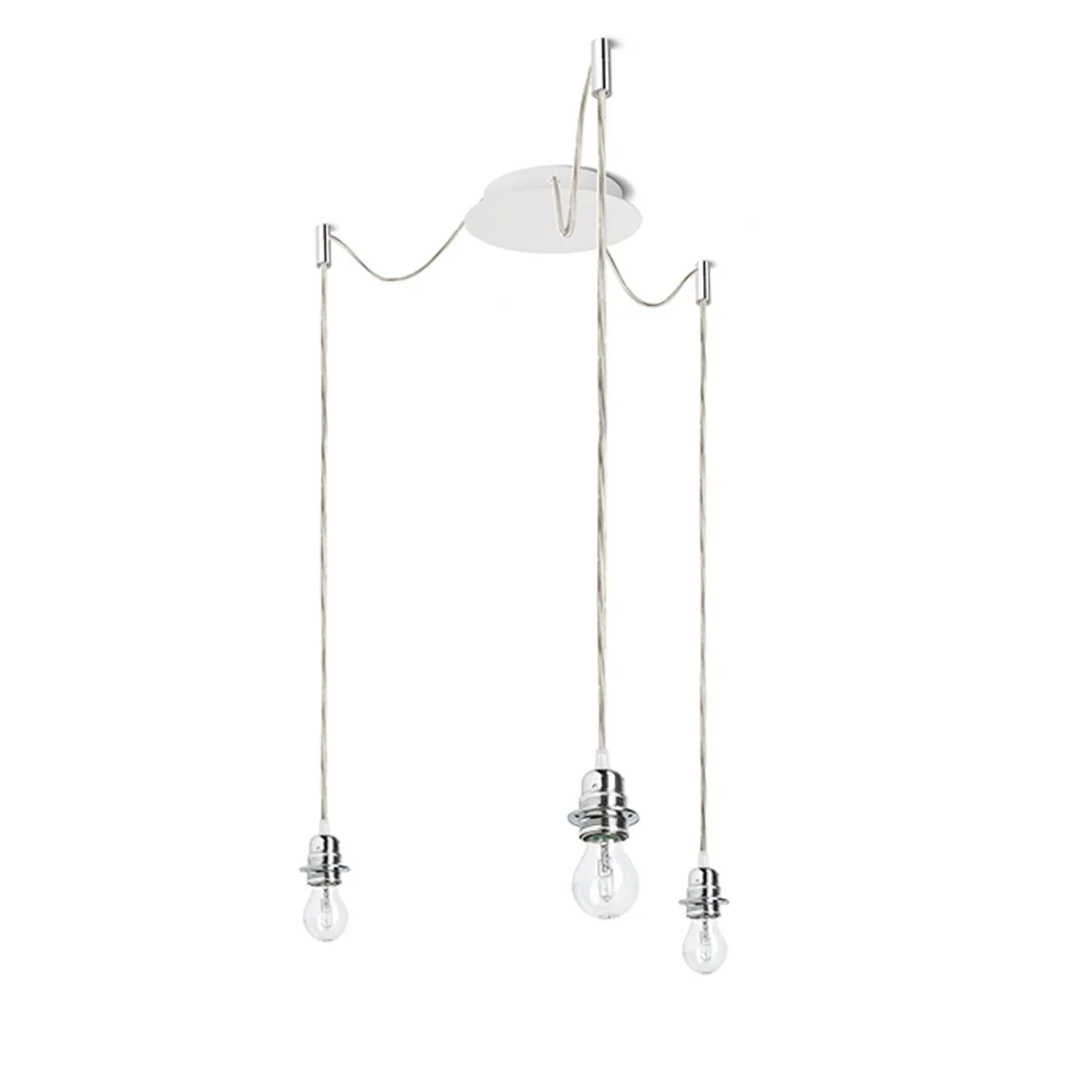 Luminaria colgante con base de techo central y tres cuerdas textiles individuales con base de metal E27. Las cuerdas de suspensión están equipadas con agarres de techo de cromo, que se pueden colocar a cualquier distancia desde la base a la longitud de la cuerda de 3 m. Adecuado para pantallas: ARISTA, DELI, JAKARANDA, DOUBLE 40/30, DOUBLE 55/30, ASPRO 40/30, ASPRO 55/30, RON 15/20, RON 40/25, RON 55/30, 30, TEMPO 30/19.