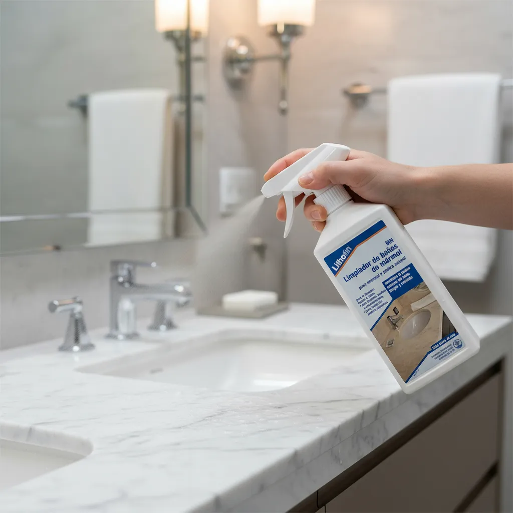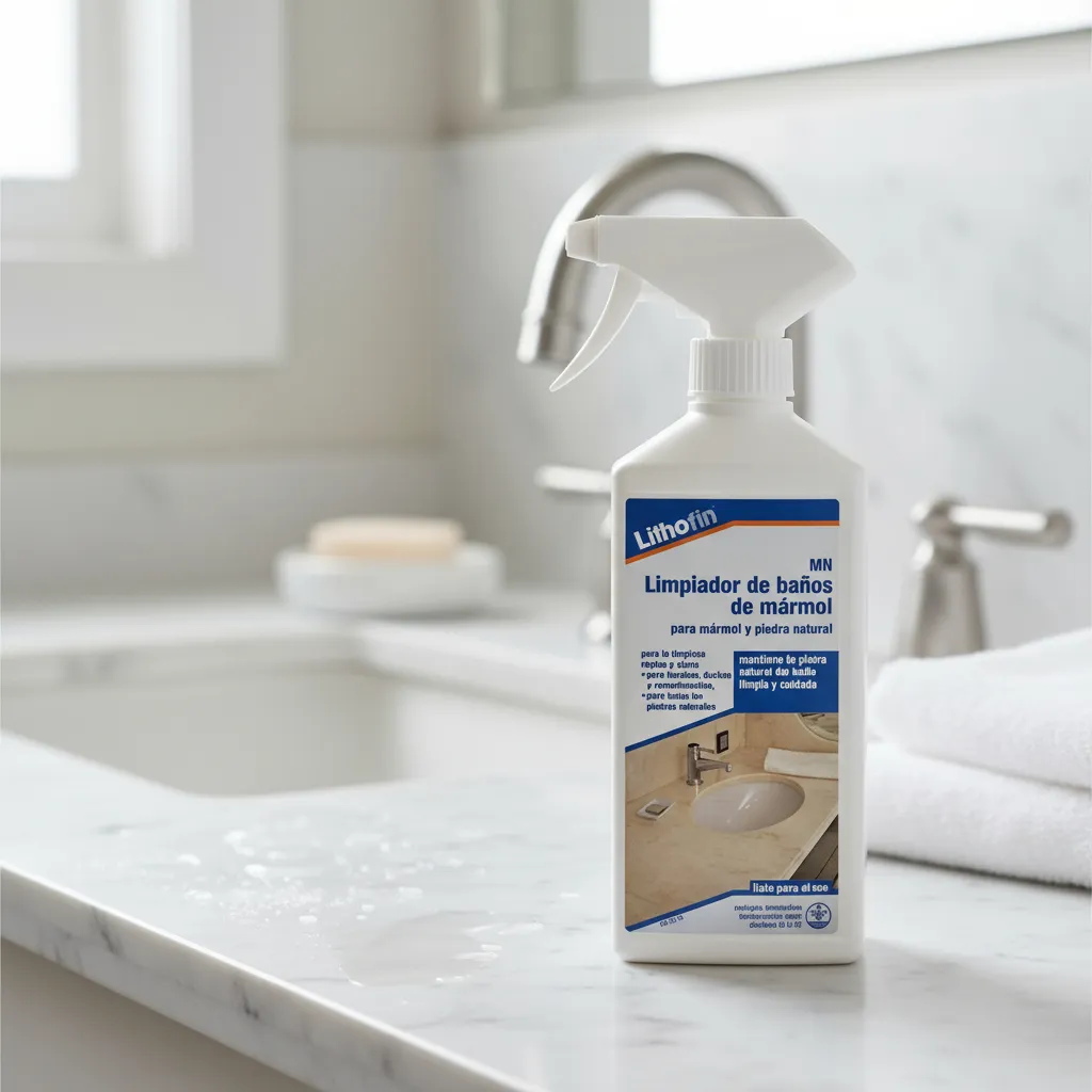 El Lithofin MN Limpiador de Baños de Mármol está especialmente formulado para limpiar a fondo mármol, granito, silestone y piedra caliza sin dañar sus superficies. Su fórmula sin ácidos elimina eficazmente restos de jabón, sarro y sales, manteniendo el brillo natural del material.