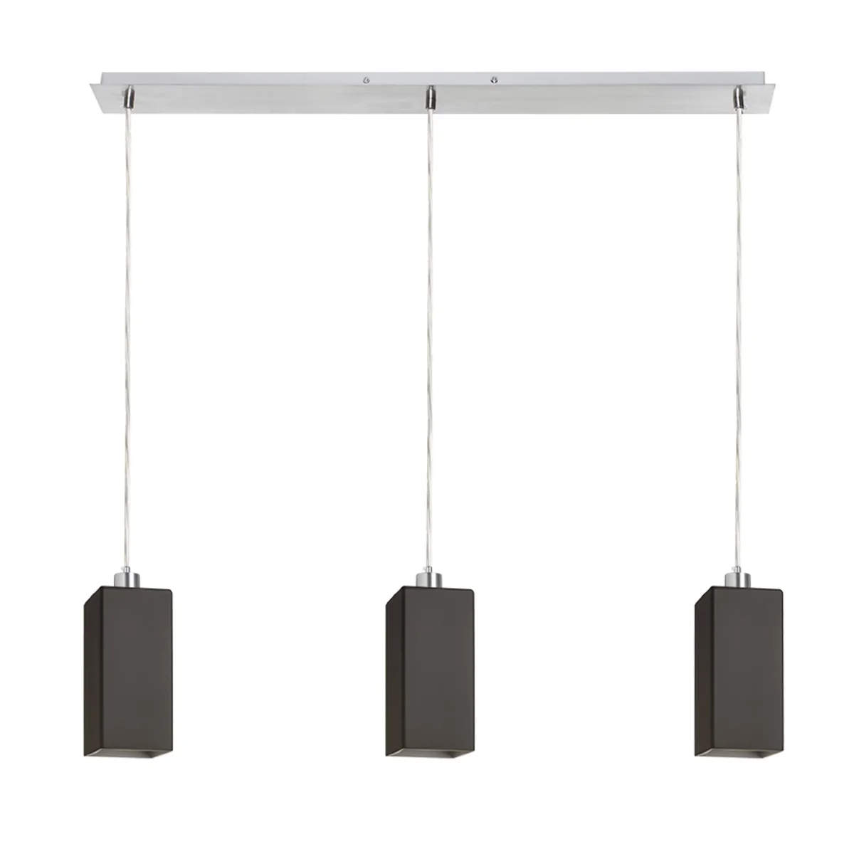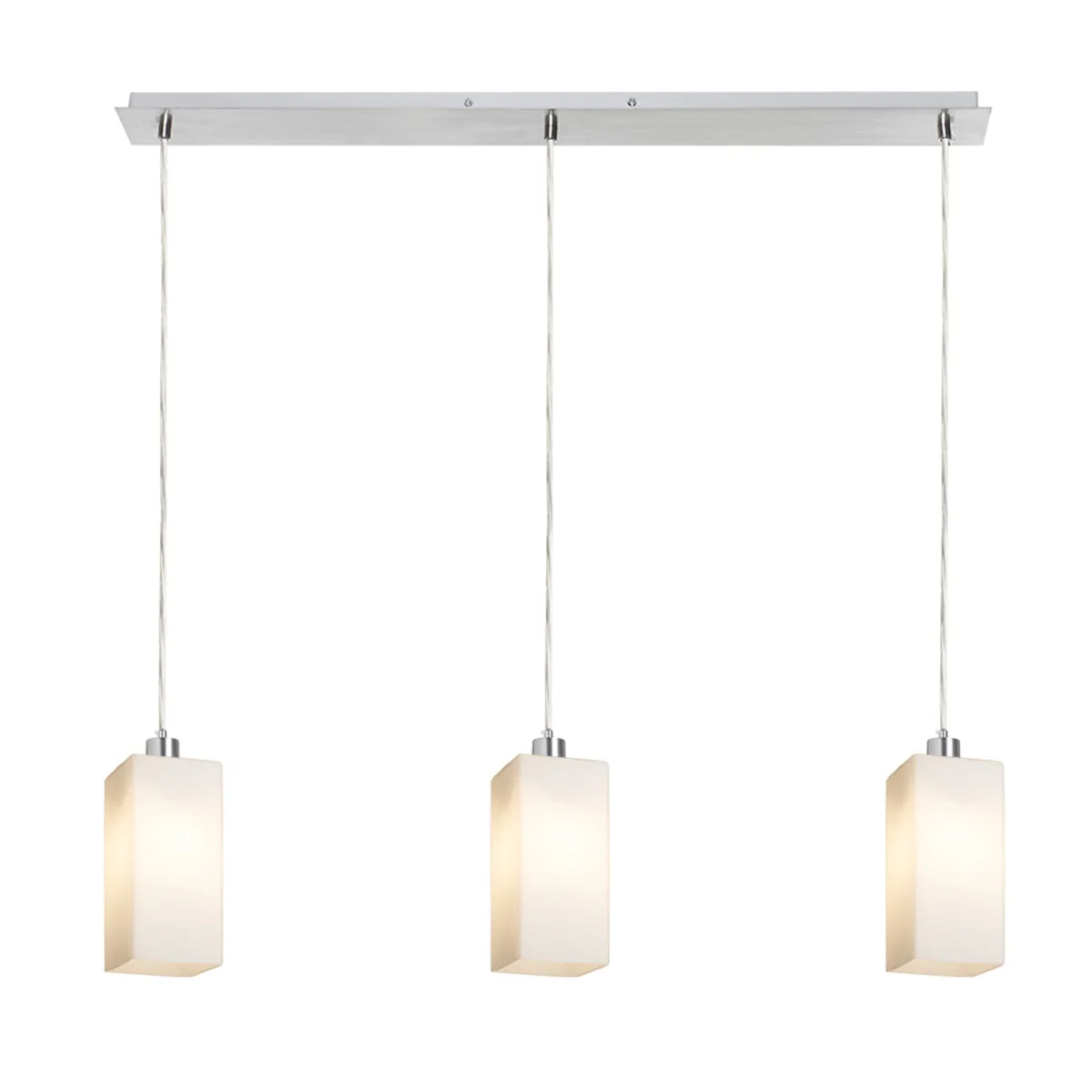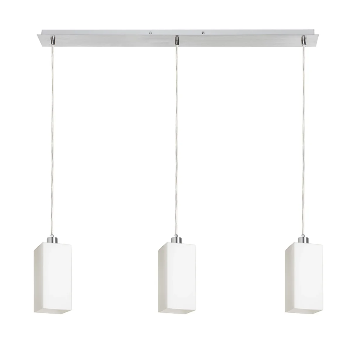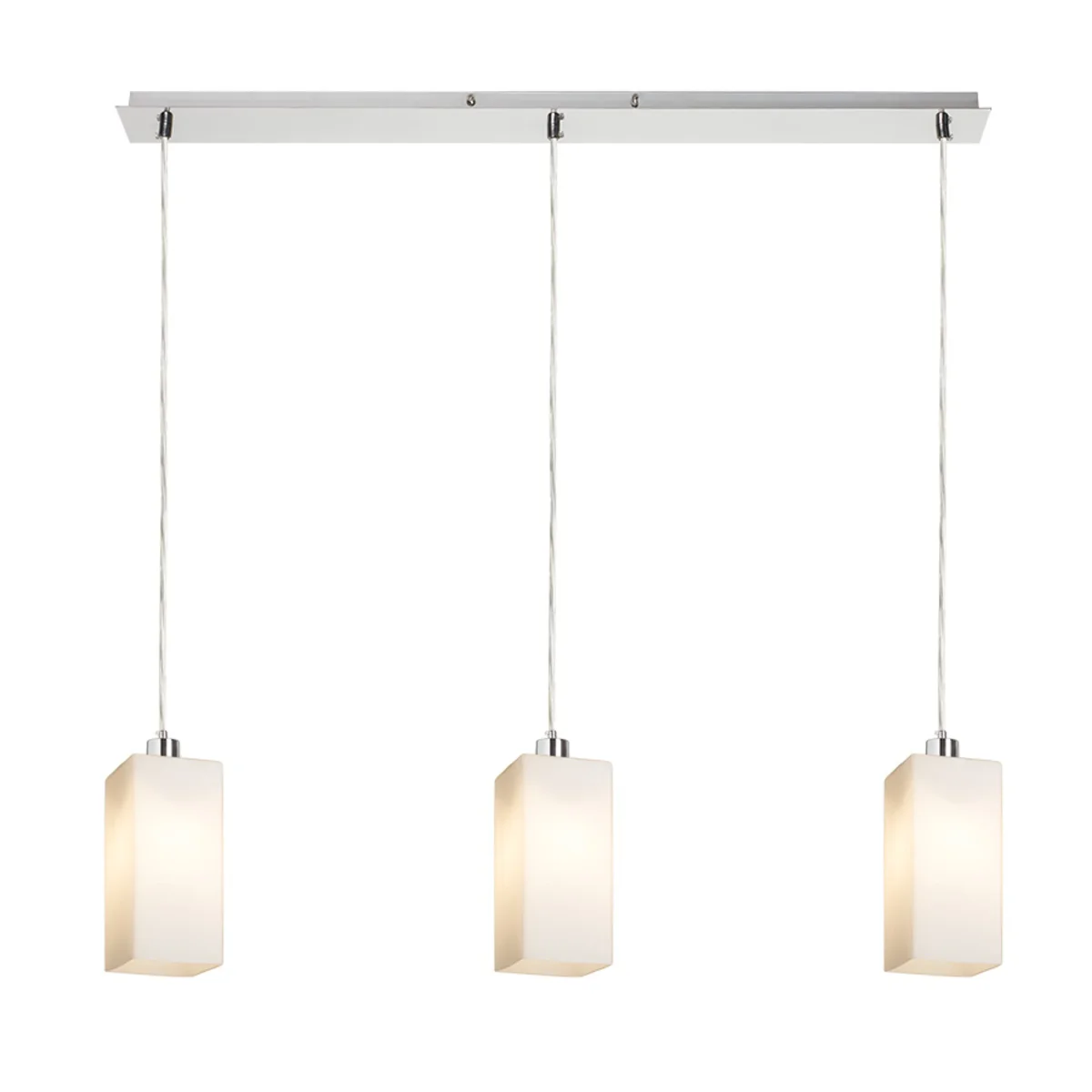 Lámpara colgante lineal con pantallas de cristal para fuentes de luz LED E27. Apta para colocar encima de una mesa de comedor.