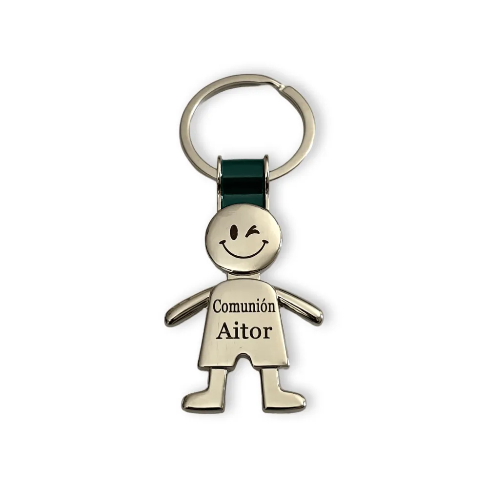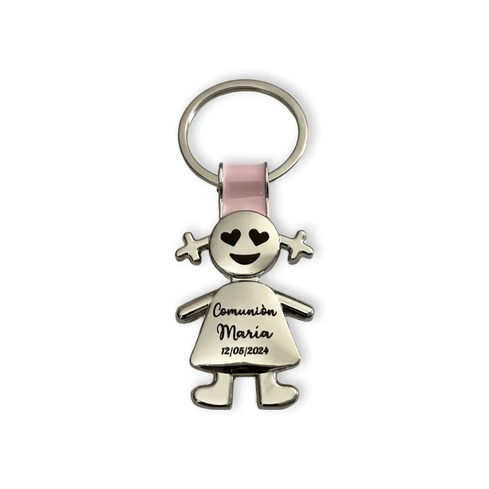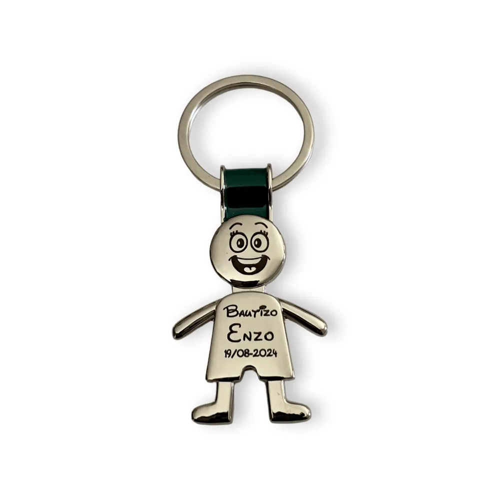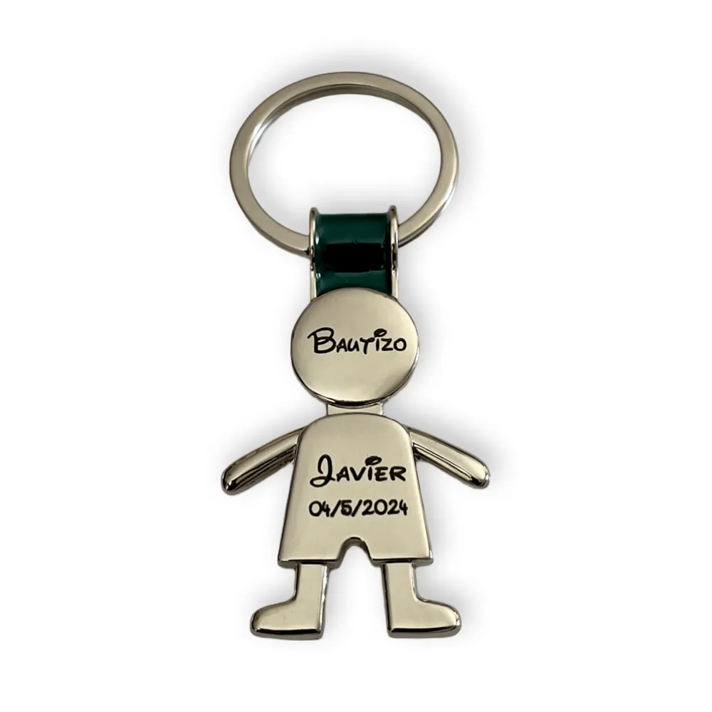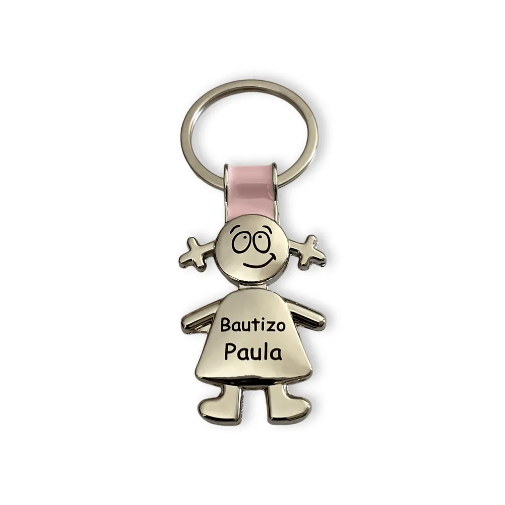 Llavero bautizo personalizado en forma de niño o niña con carita a elegir y grabado en tres líneas: evento, nombre y fecha. Presentado en caja negra, perfecto como detalle.