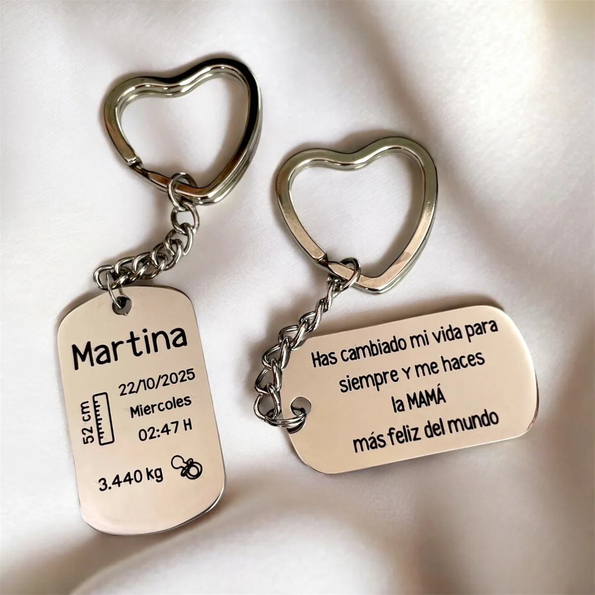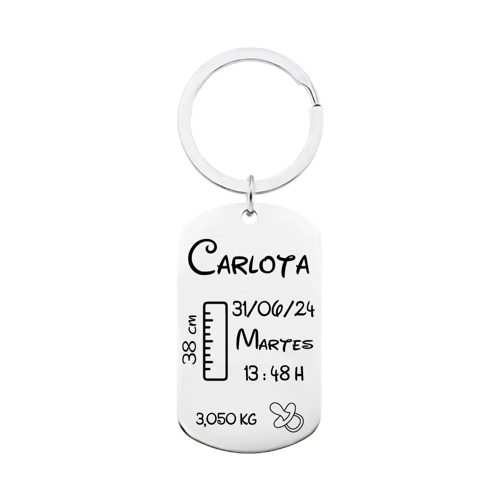 - ✍️ Grabado láser profesional: Personaliza el llavero con el nombre del bebé, fecha, hora, peso y altura. También puedes añadir una dedicatoria o un pequeño dibujo en la parte trasera.