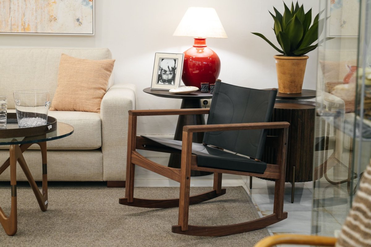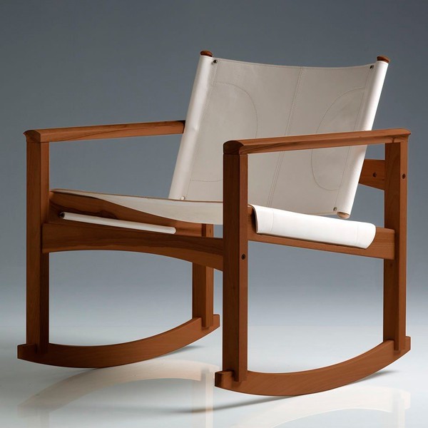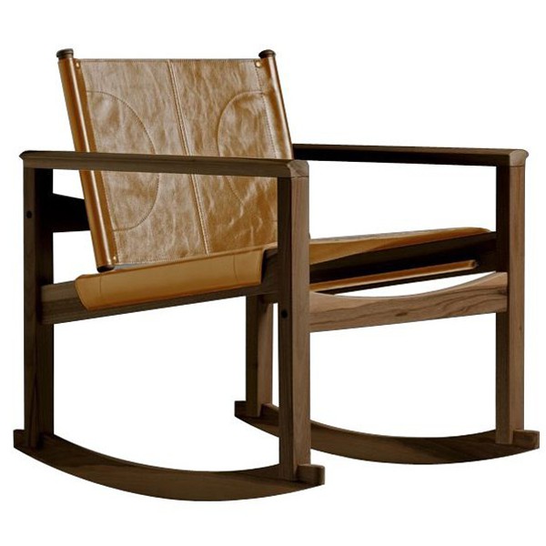 Mecedora con estructura en madera maciza en roble o nogal. Tejido en piel en diferentes colores.