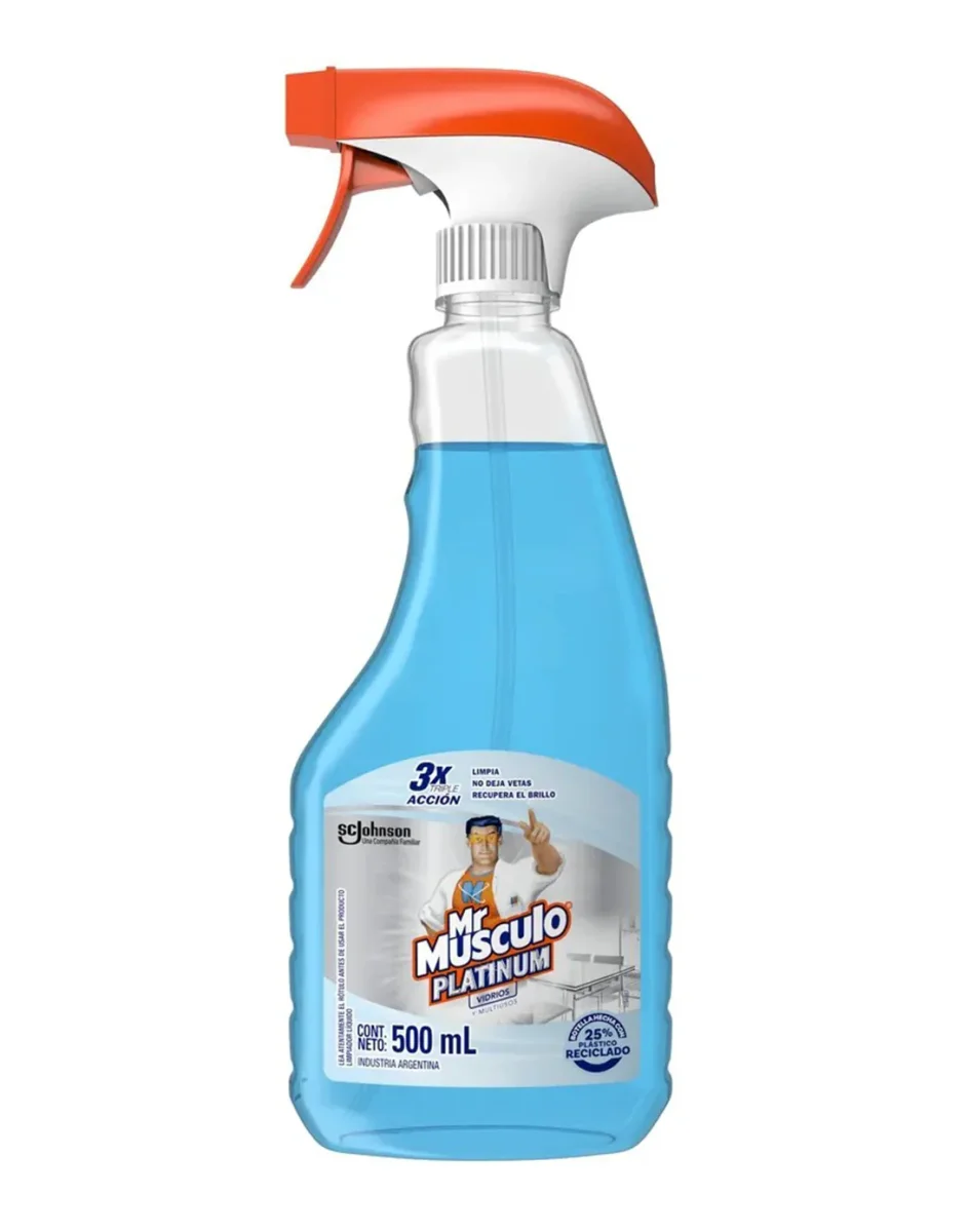 Mr. Músculo Vidrios y Multiuso Platinum ofrece una limpieza profunda y un brillo impecable sin vetas, ideal para mantener tu hogar reluciente por más tiempo.