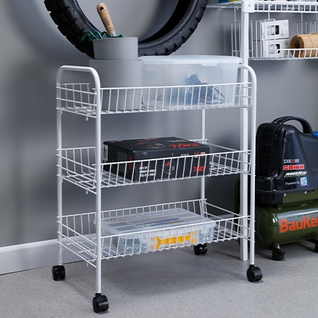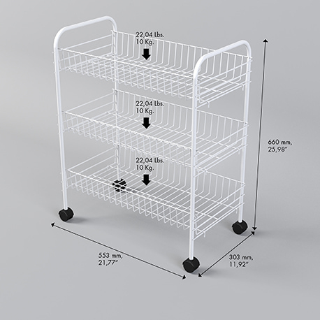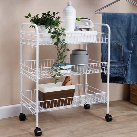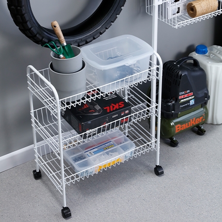 Gracias a sus tres niveles de almacenamiento, puedes organizar productos de aseo, artículos de cocina, papelería, ropa, juguetes o herramientas. Las ruedas incorporadas facilitan su movilidad, permitiéndote adaptarlo según tus necesidades.