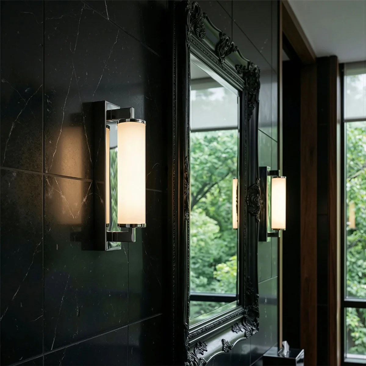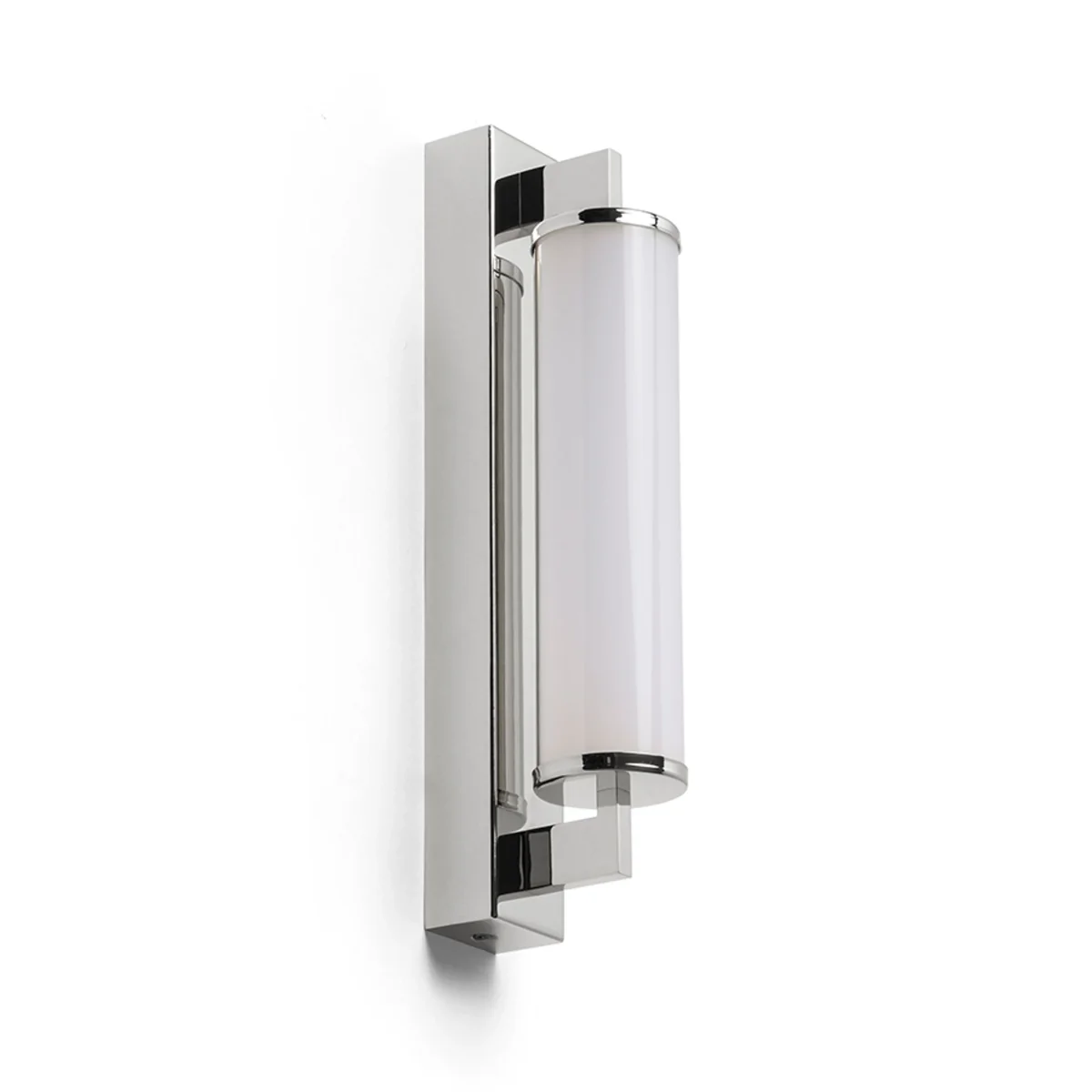 Luminaria de baño lineal con LED incorporado y pantalla en forma de tubo de color opal sobre una base sólida angular.