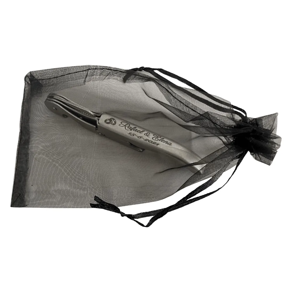 El sacacorchos personalizado para boda y eventos tipo loro, fabricado en acero inoxidable con acabado mate, es un detalle elegante y útil para tus invitados. Incluye grabado láser imborrable con nombres, fecha, logotipo o dibujo u otro diseño especial.