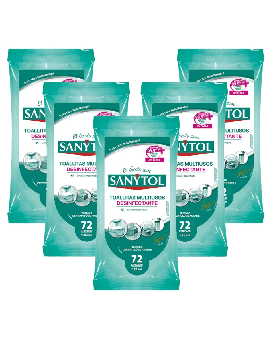 Las toallitas desinfectantes SANYTOL son prácticas, rápidas y eficaces. Ideales para la limpieza diaria, eliminan gérmenes mientras dejan un agradable aroma a eucalipto. Perfectas para usar en el hogar, objetos de uso diario e incluso en el entorno del bebé.