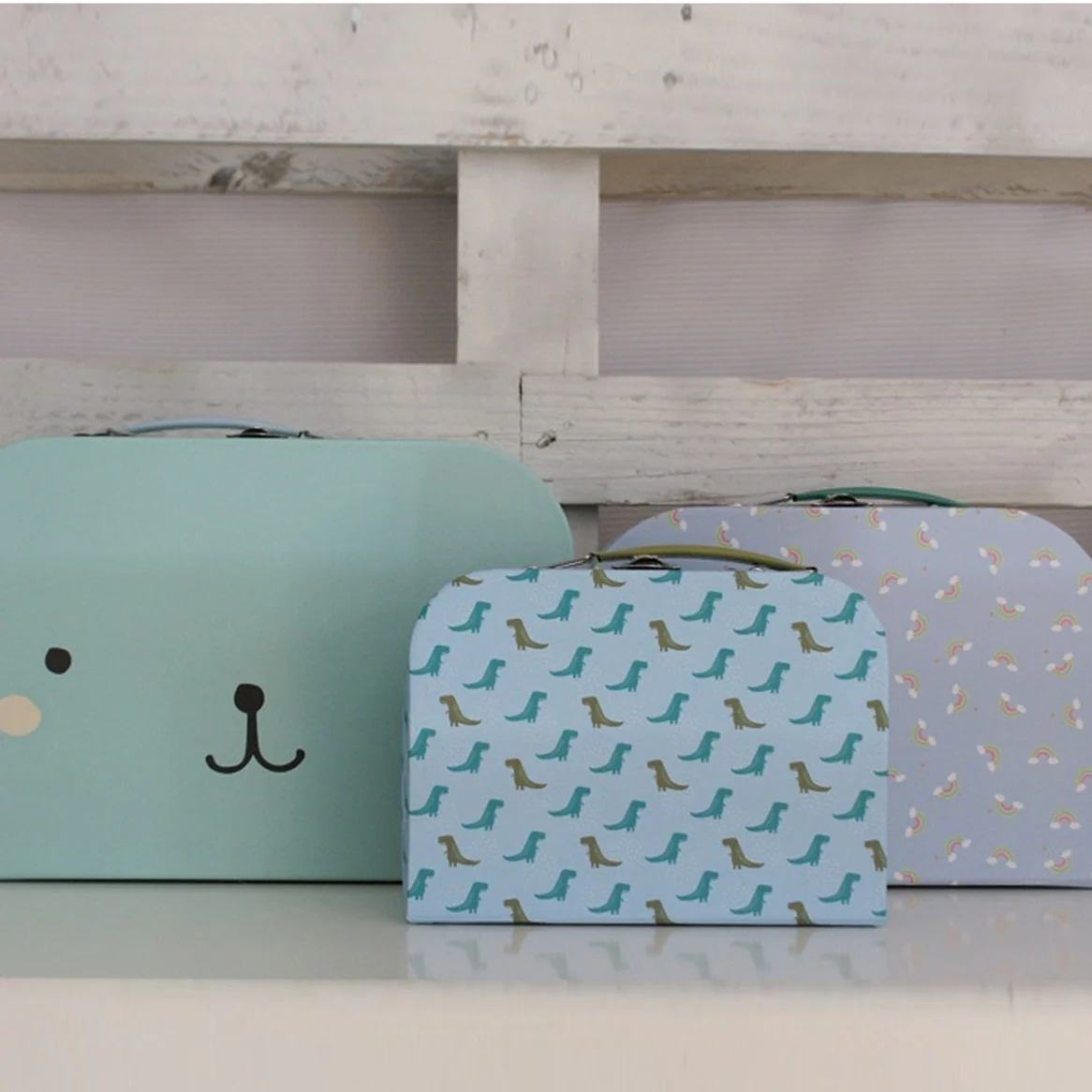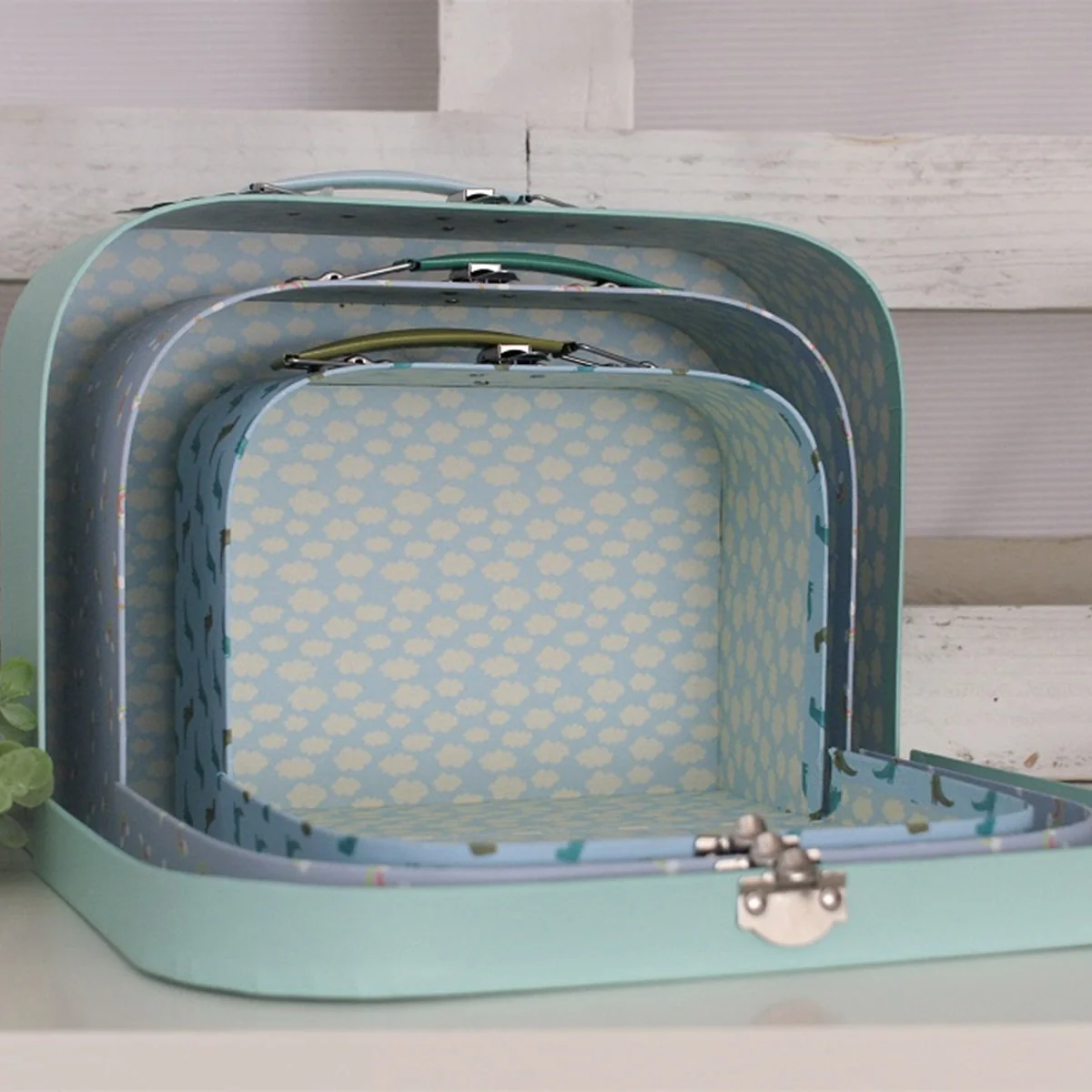 Set de maletas de varios tamaños con diferentes estampados en tonos azules y verdes.