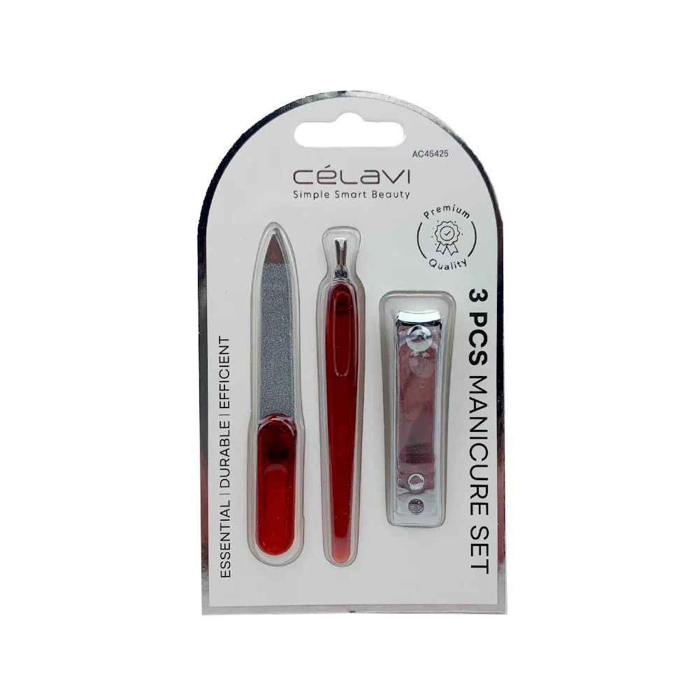 El Set de Manicure de 3 piezas de CÉLAVI es el kit ideal para traer en tu bolsillo y cuidar de tus uñas. Este incluye lima para uñas, removedor de cutícula y cortauñas.