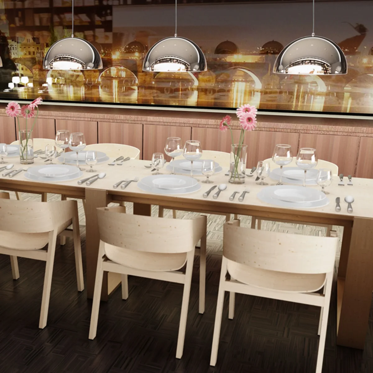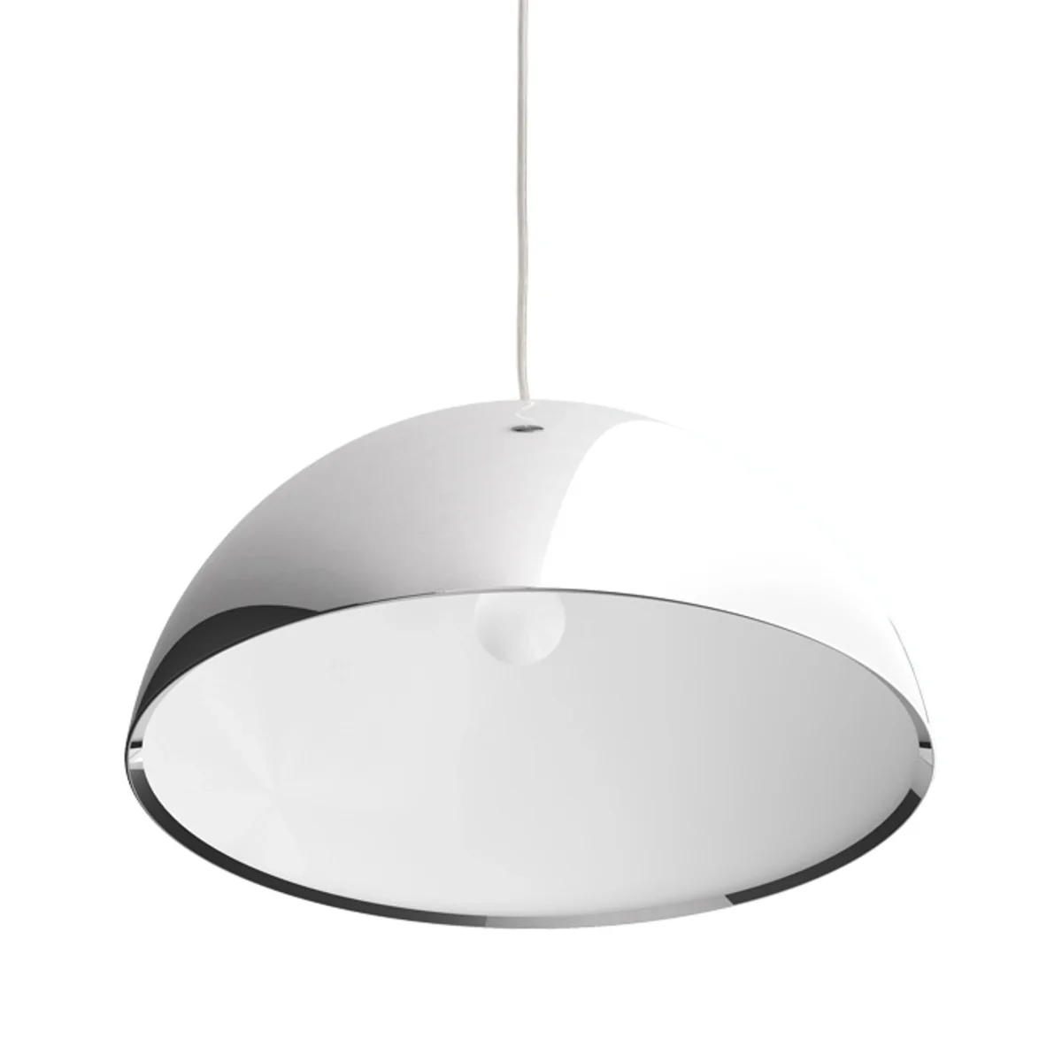 Lámpara colgante con pantalla de metal cromado, disponible en dos tamaños.