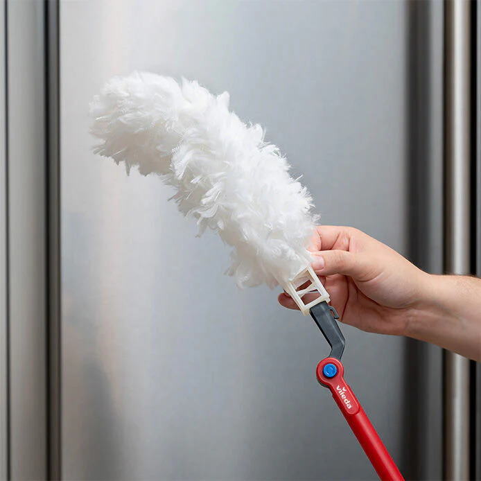 Su cabezal flexible se adapta fácilmente a objetos y rincones difíciles, envolviendo lámparas, jarrones, ventiladores o persianas sin rayar ni dañar las superficies. El mango extensible hasta 90 cm permite alcanzar lugares altos y bajos sin necesidad de escaleras.