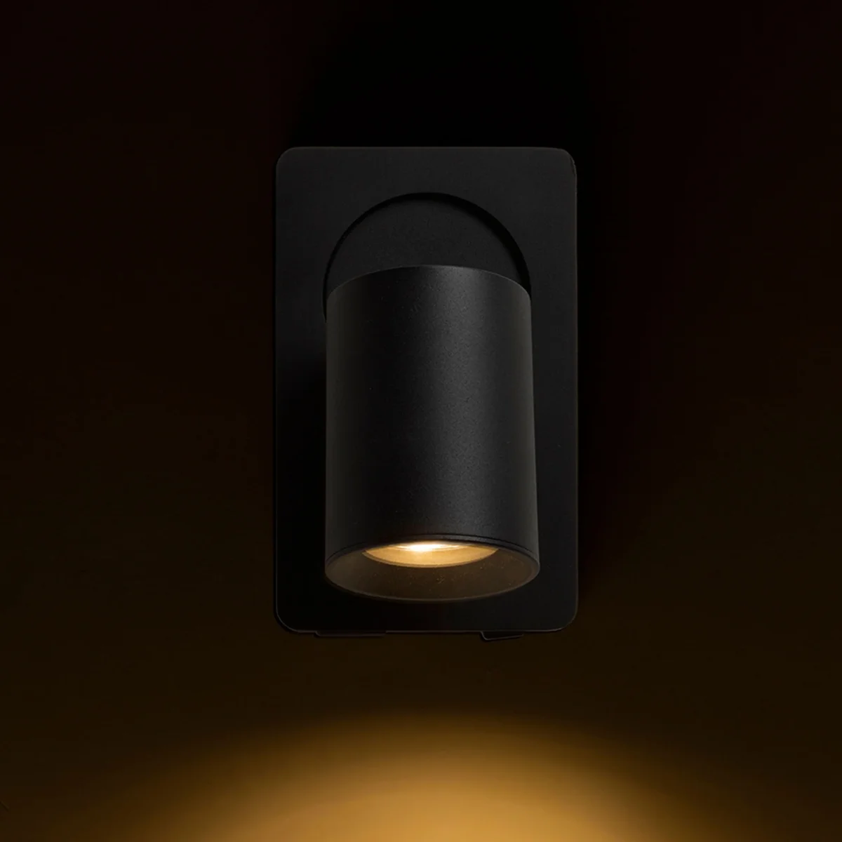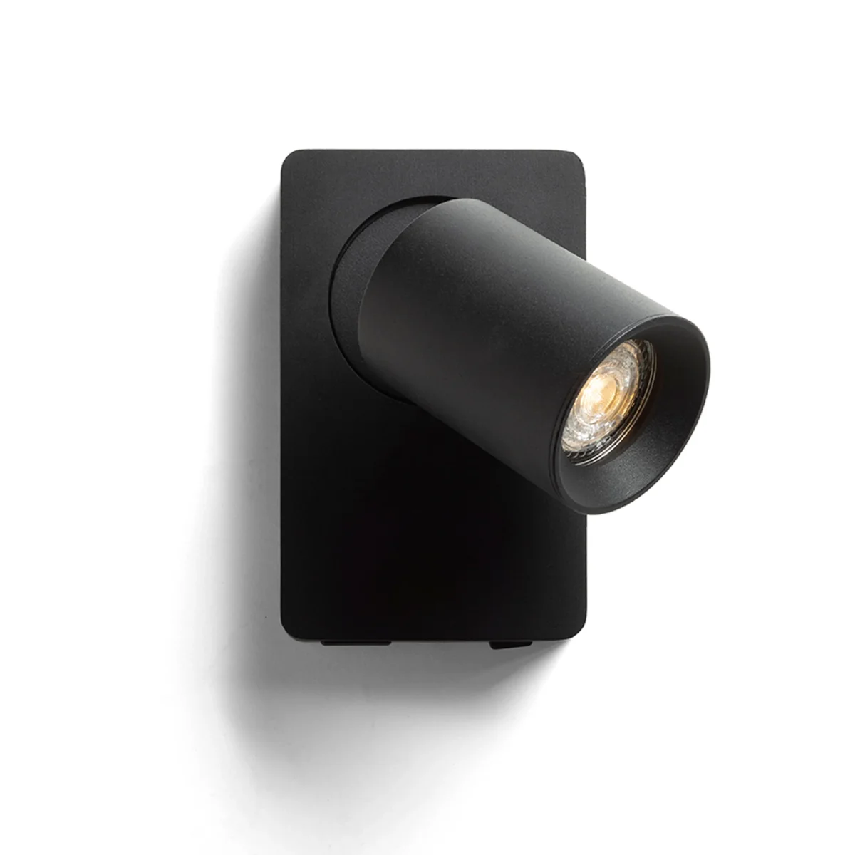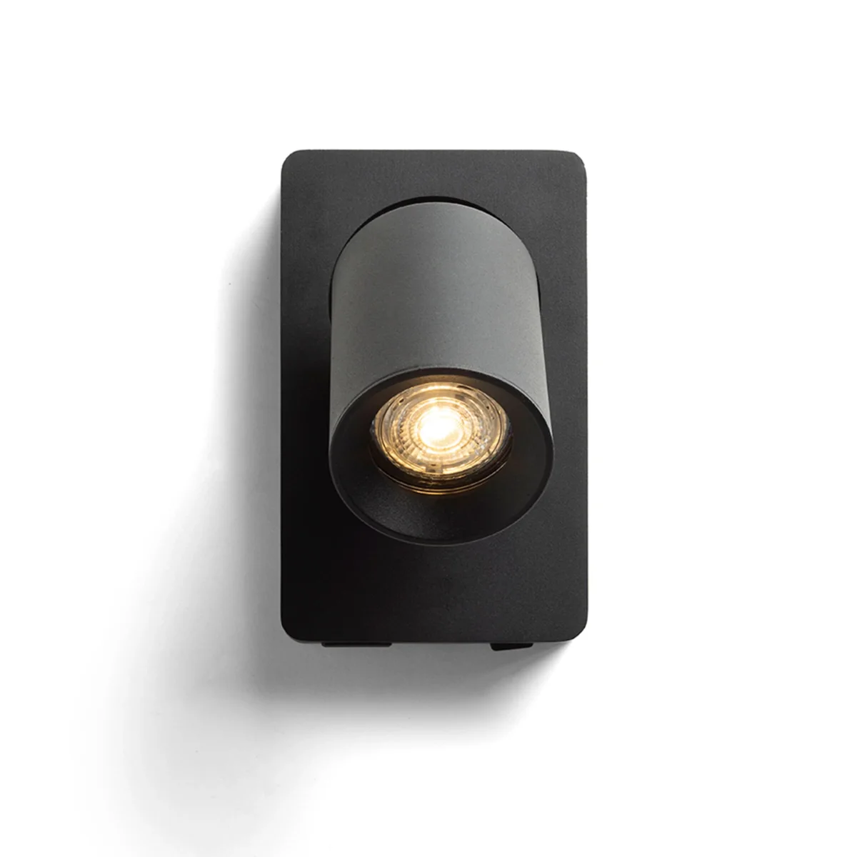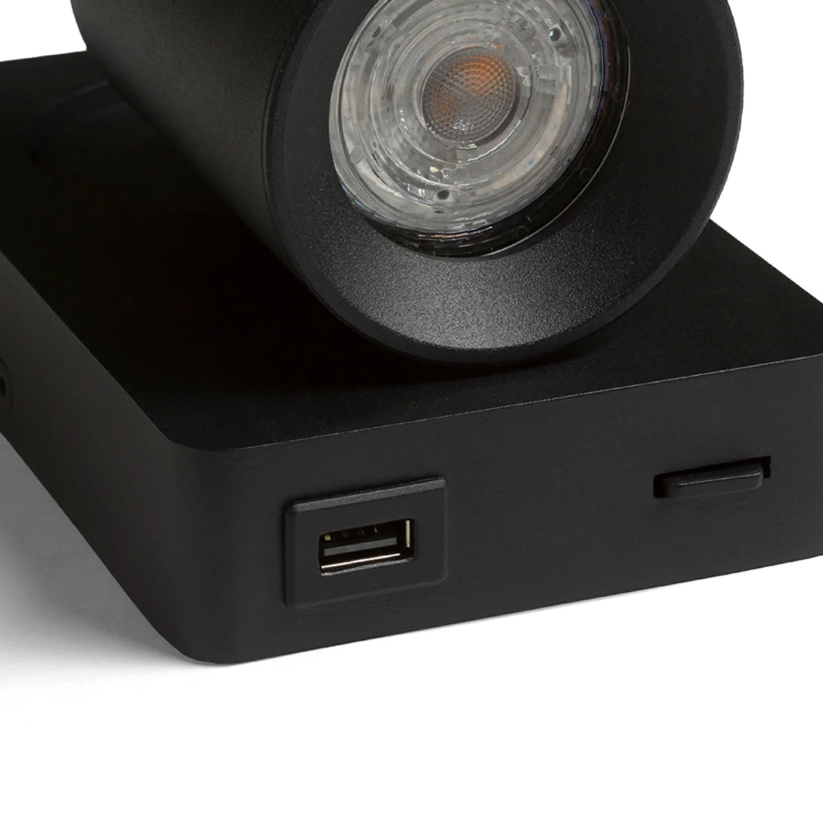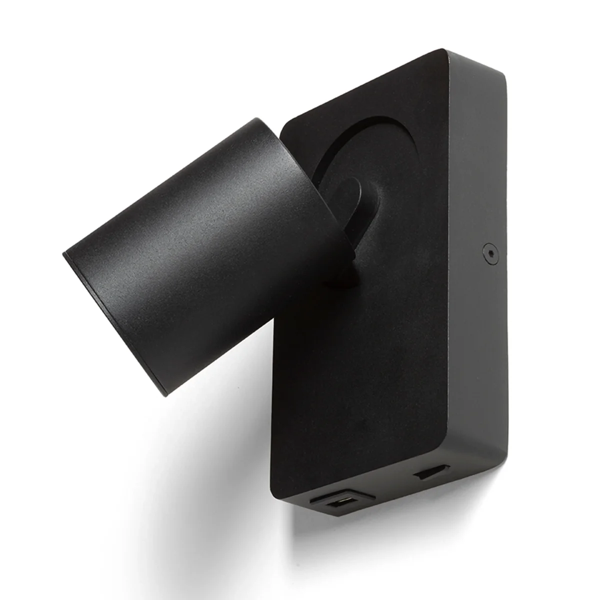 Luminaria de pared laqueada con reflector basculante para fuentes de luz con casquillo GU10. La luminaria tiene un puerto USB integrado en la base, apto para cargar, por ejemplo, un teléfono.