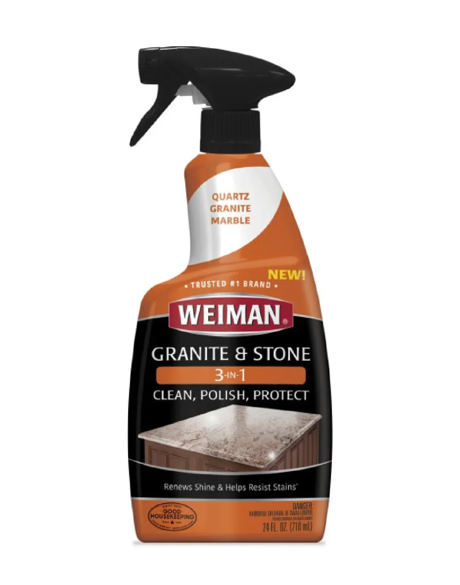 Weiman Granite & Stone 3 en 1 Limpia, Pule, Protege y renueva el brillo, ayuda a resistir las manchas en las superficies de piedra sellada y sólidas.