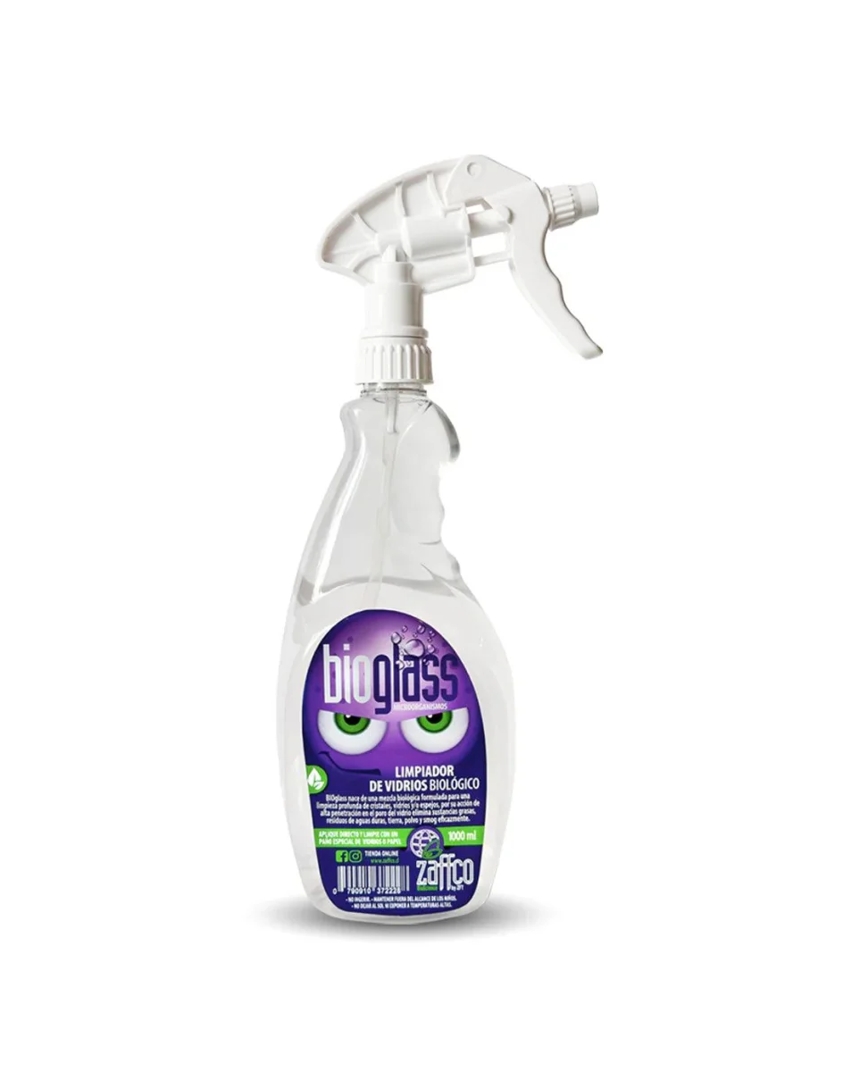 BIOglass es un limpiador que nace de una mezcla de cultivos biológicos formulado para proporcionar una limpieza profunda de vidrios y espejos, por su acción de alta penetración en el poro del vidrio elimina sustancias grasas, incrustaciones de aguas duras, tierra, polvo y smog.